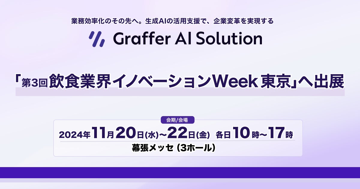 生成AI活用による企業変革を実現する株式会社グラファー(本社:東京都渋谷区、代表取締役:石井大地、以下「当社」)は、2024年11月20日(水)〜22日(金)に幕張メッセで開催される「第3回 飲食業界イノベーションWeek 東京」に出展します。