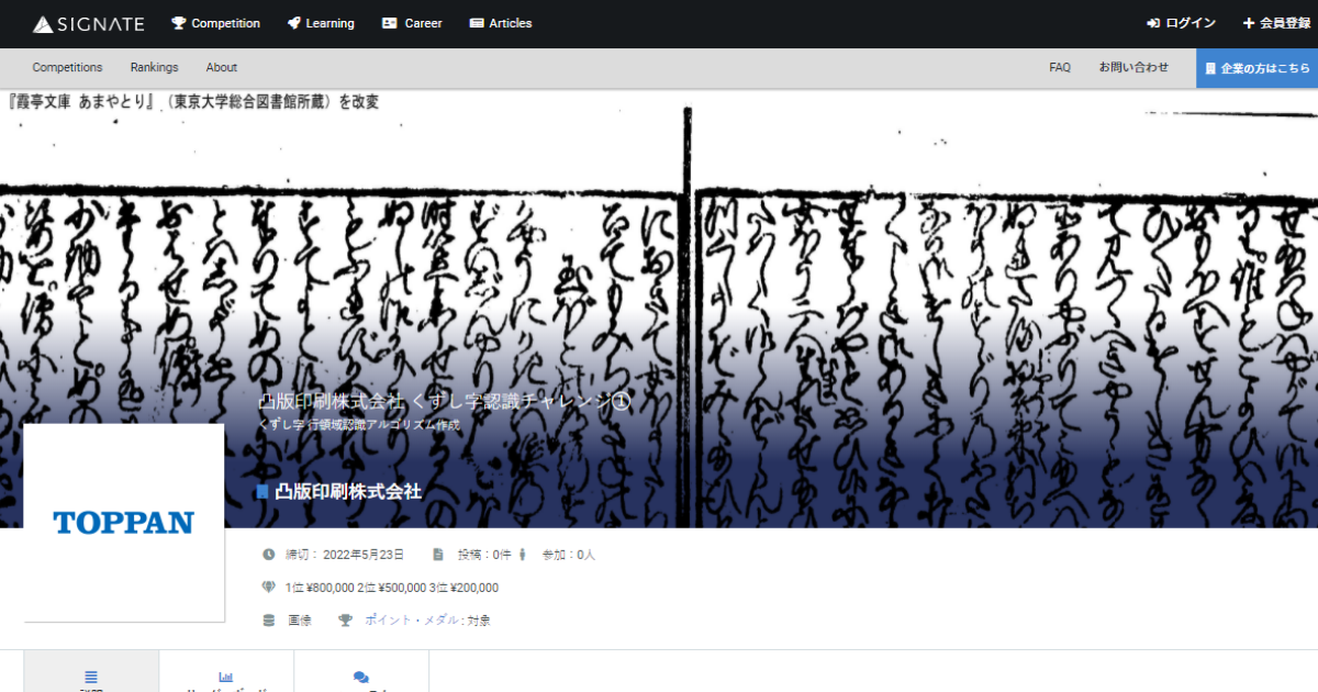 SIGNATEにて、凸版印刷主催くずし字認識コンペティション開催!
