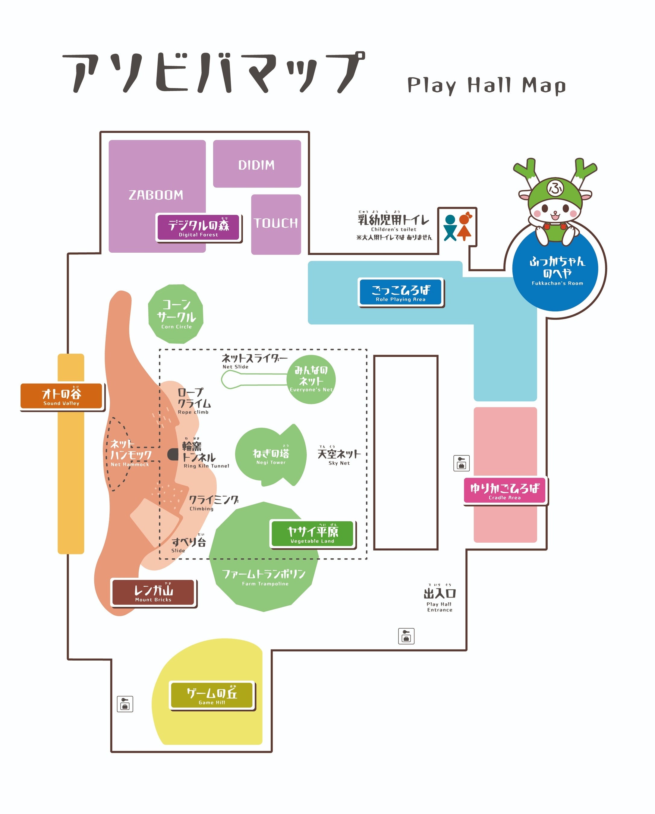 こどもふっかパークの中心となる「アソビバ」は、約900㎡の広さを誇る大空間。ここでは、こどもたち一人ひとりの「好き!」に応える、大型遊具、デジタル遊具、インクルーシブ遊具などのあそびの体験が広がります。アソビバは7つのエリアに分かれており、それぞれのテーマに沿った遊具や仕掛けが設置されています。