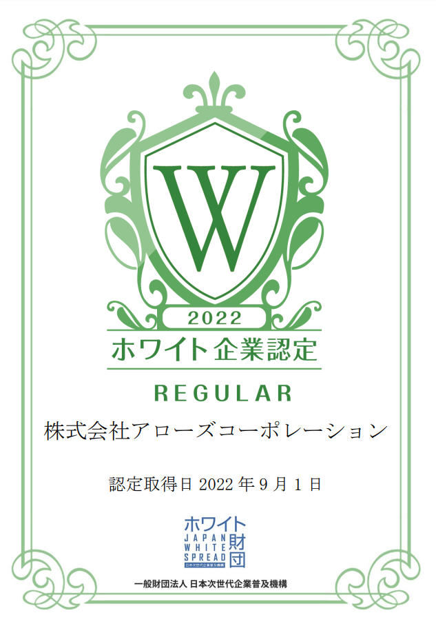 株式会社アローズコーポレーションが、一般財団法人日本次世代企業普及機構(通称:ホワイト財団)が運営する「ホワイト企業認定 レギュラー」を取得しましたことをお知らせいたします。