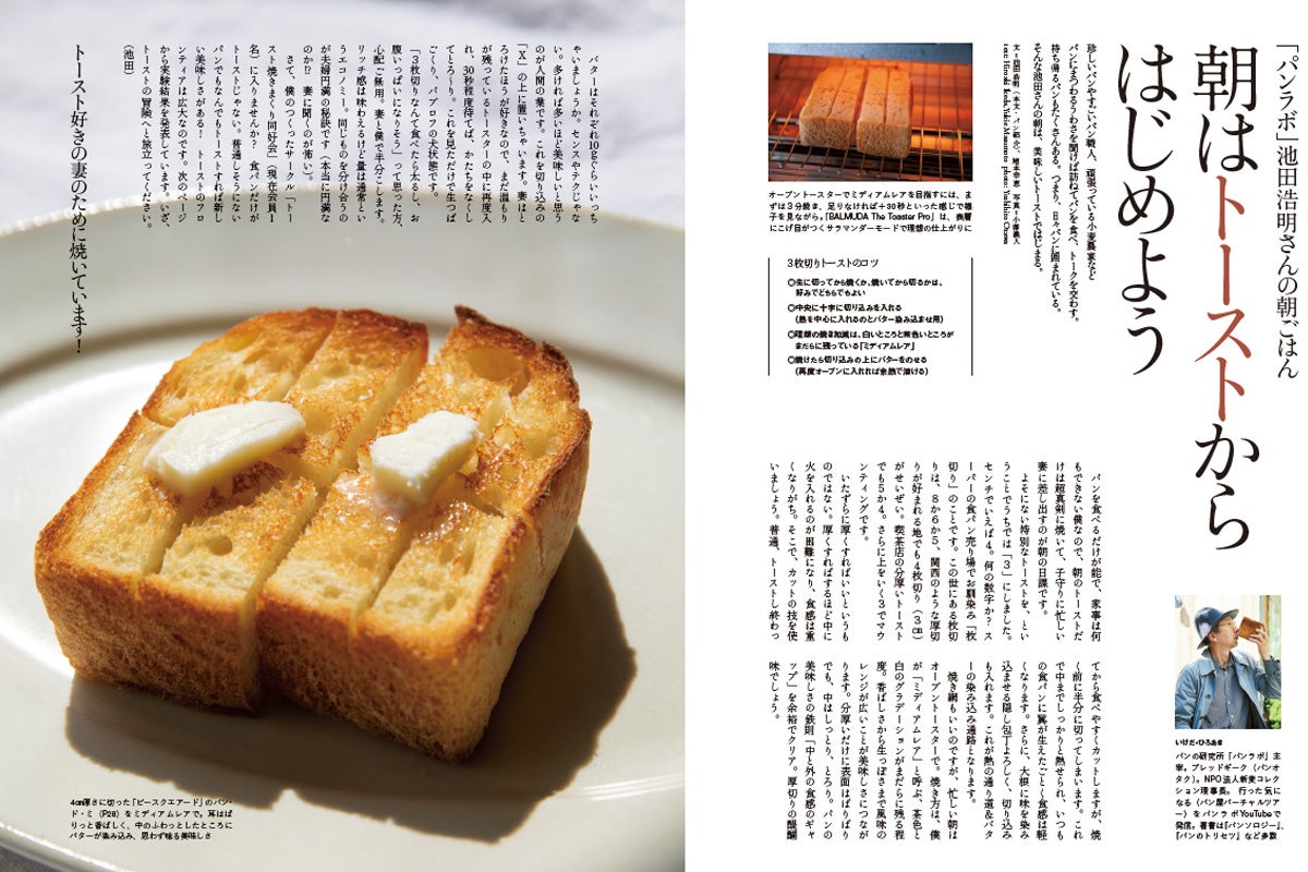 珍しいパンやすごいパン職人、頑張っている小麦農家など、パンにまつわるうわさを聞けば訪ねてパンを食べ、トークを交わす。持ち帰るパンもたくさんある…。そんな日々パンに囲まれているという、パンの研究所「パンラボ」主宰であり、ブレッドギーク(パンオタク)と自負する、池田浩明さんに、朝食のパンといえば?とたずねてみたことがきっかけで誕生した「トースト」企画です。池田さん自身が奥さんのために焼いているというトーストのこだわりから、家でトーストして食べてみたい注目のパン、より美味しさを追求したベーカリーカフェのトーストメニューまで、池田さんのトースト愛がぎゅっと詰まった、朝はパン派必見のページです。