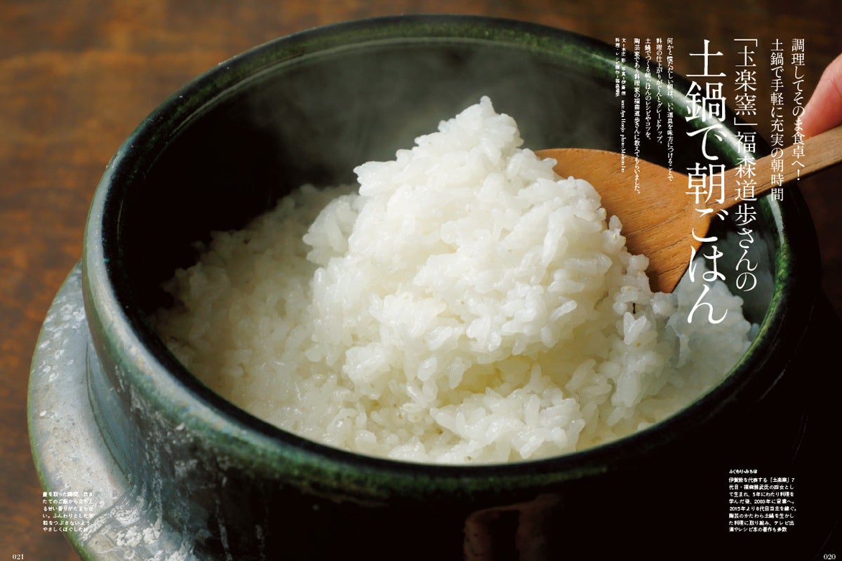 江戸時代から続く伊賀焼の窯元「土楽窯」。8代目当主の福森道歩さんは、作陶に取り組みつつ、料理人として土鍋をつかったレシピを提案。そんな道歩さんに、土鍋をつかった朝食アイデアを教えていただいています。一瞬、ハードルが高いような印象があるかもしれませんが、調理道具でもありうつわにもなる土鍋(特に小さいサイズの土鍋)は、工夫次第で洗い物も少なく済ませることができ、仕込みに手間をかけなくとも、土鍋の力が美味しくしてくれるのです。基本の炊飯から、蒸し野菜、そしてフレンチトーストまで、朝の食卓をグレードアップしてくれるレシピを紹介しています。