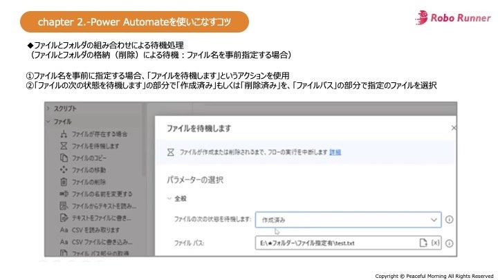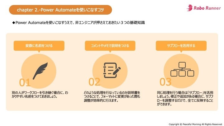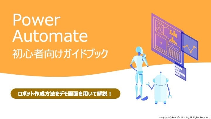 約1,000名のRPAエンジニア・コンサルタントが登録する「RPAプロフェッショナル」、RPA導入後の伴走型支援サービス「Robo Runner(ロボランナー)」等、RPA領域で包括的にサービスを展開するPeaceful Morning株式会社(本社:東京都渋谷区、代表取締役:田中 雄太 以下「当社」)は、Power Automateの初心者向けガイドブックを公開します。