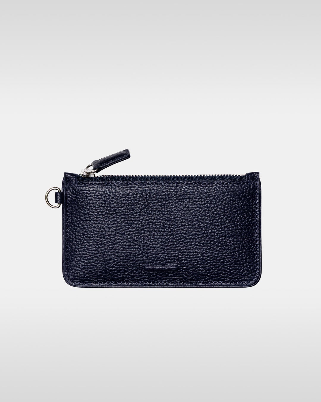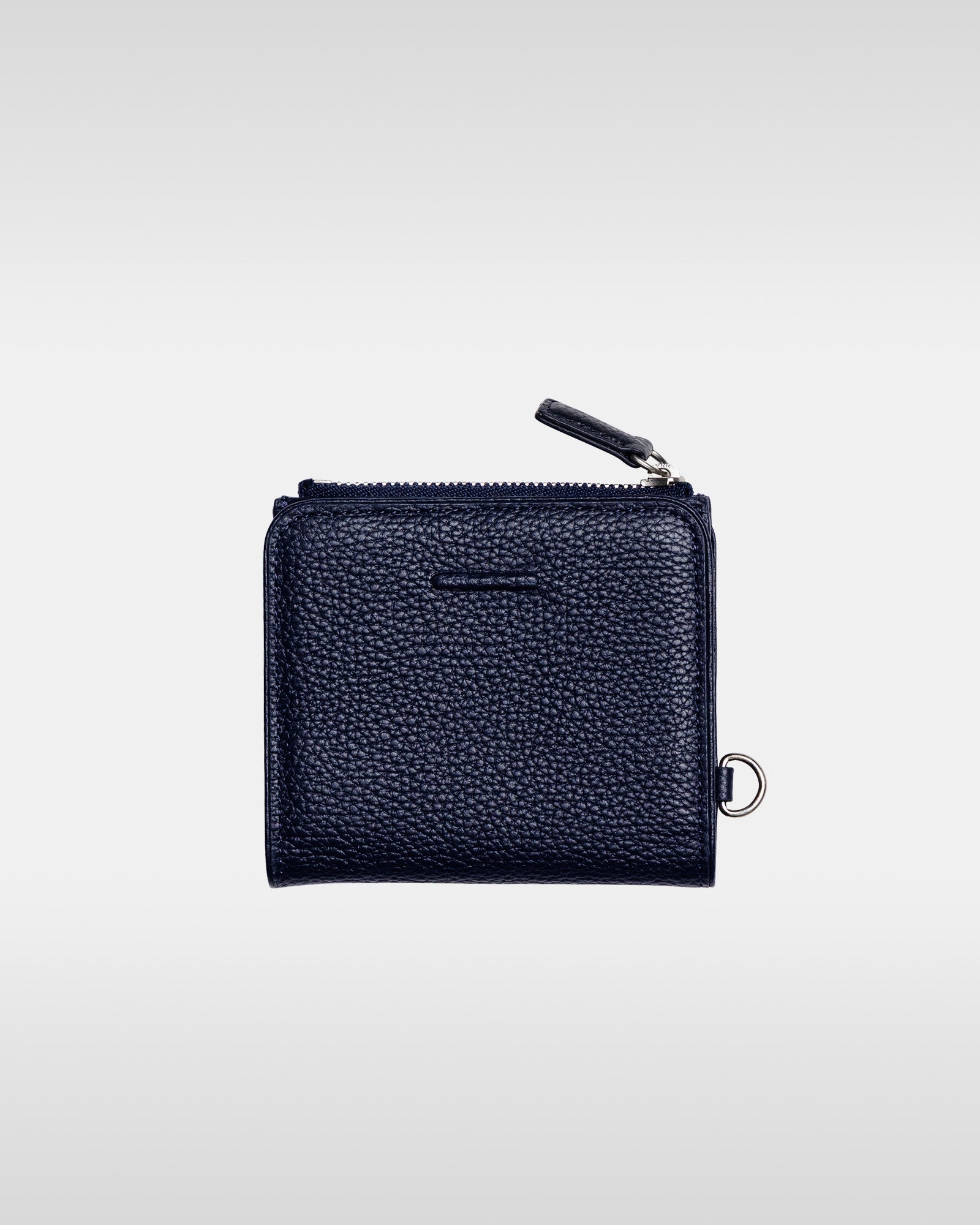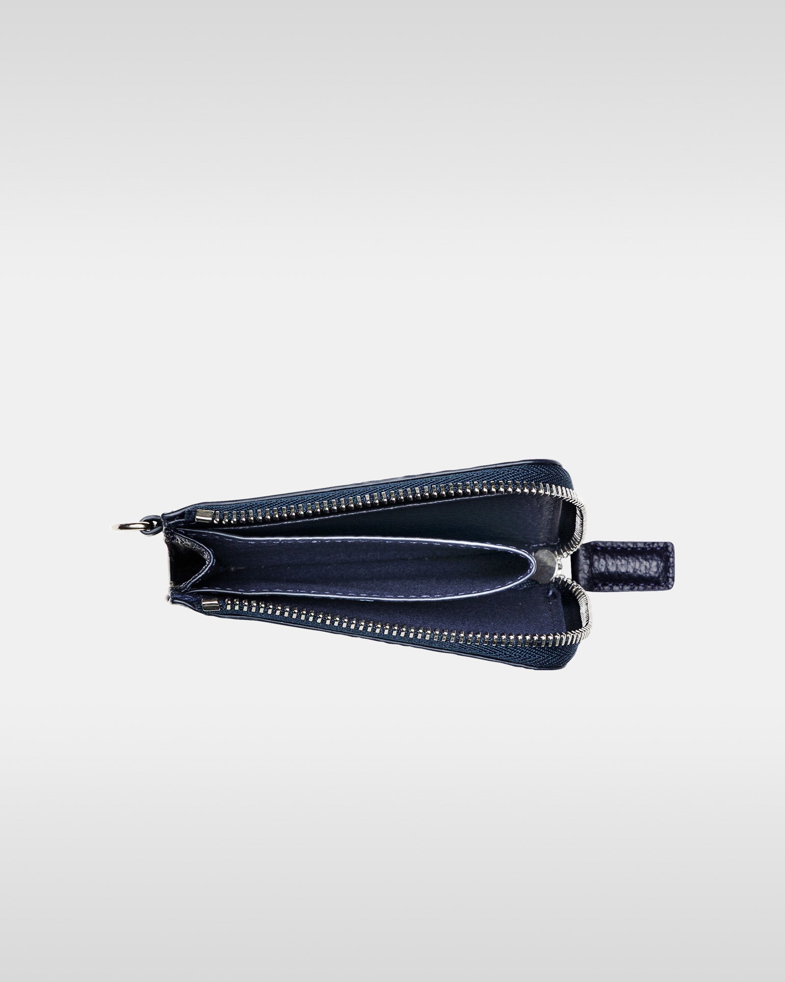 深みのあるネイビーが上質なレザーに映え、手元に品格を添えるコンパクトなスリムウォレット。カードと少額の現金をスマートに収納でき、最低限のアイテムだけでミニマルに外出したい日にも活躍します。