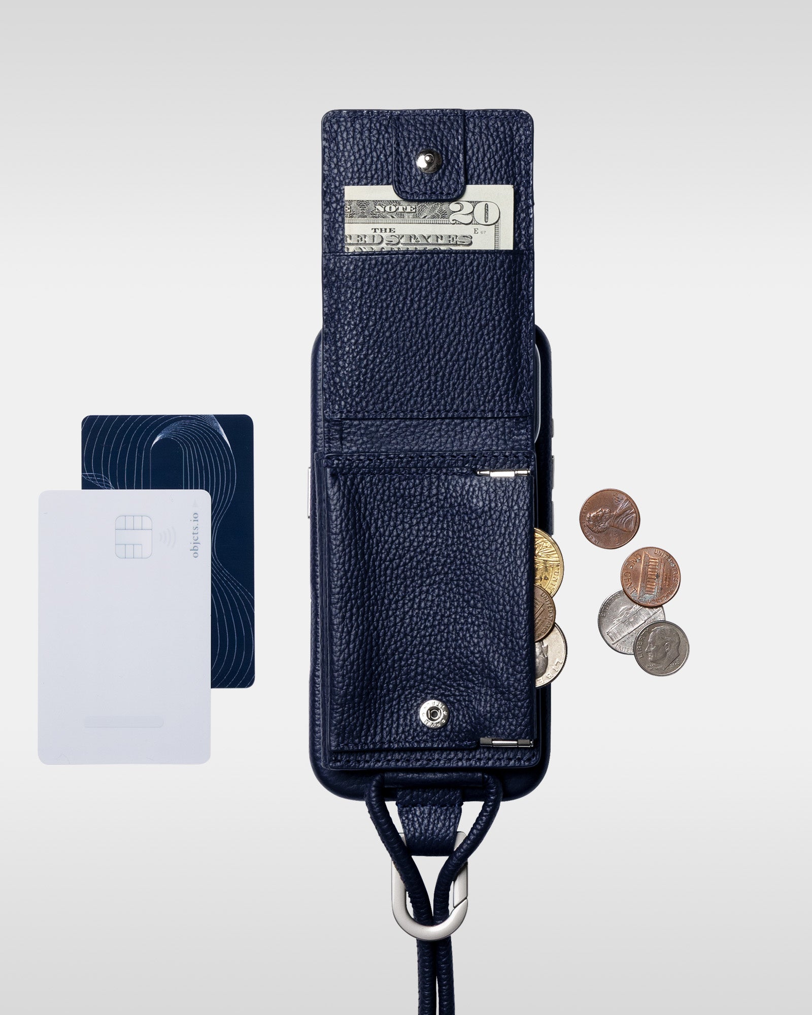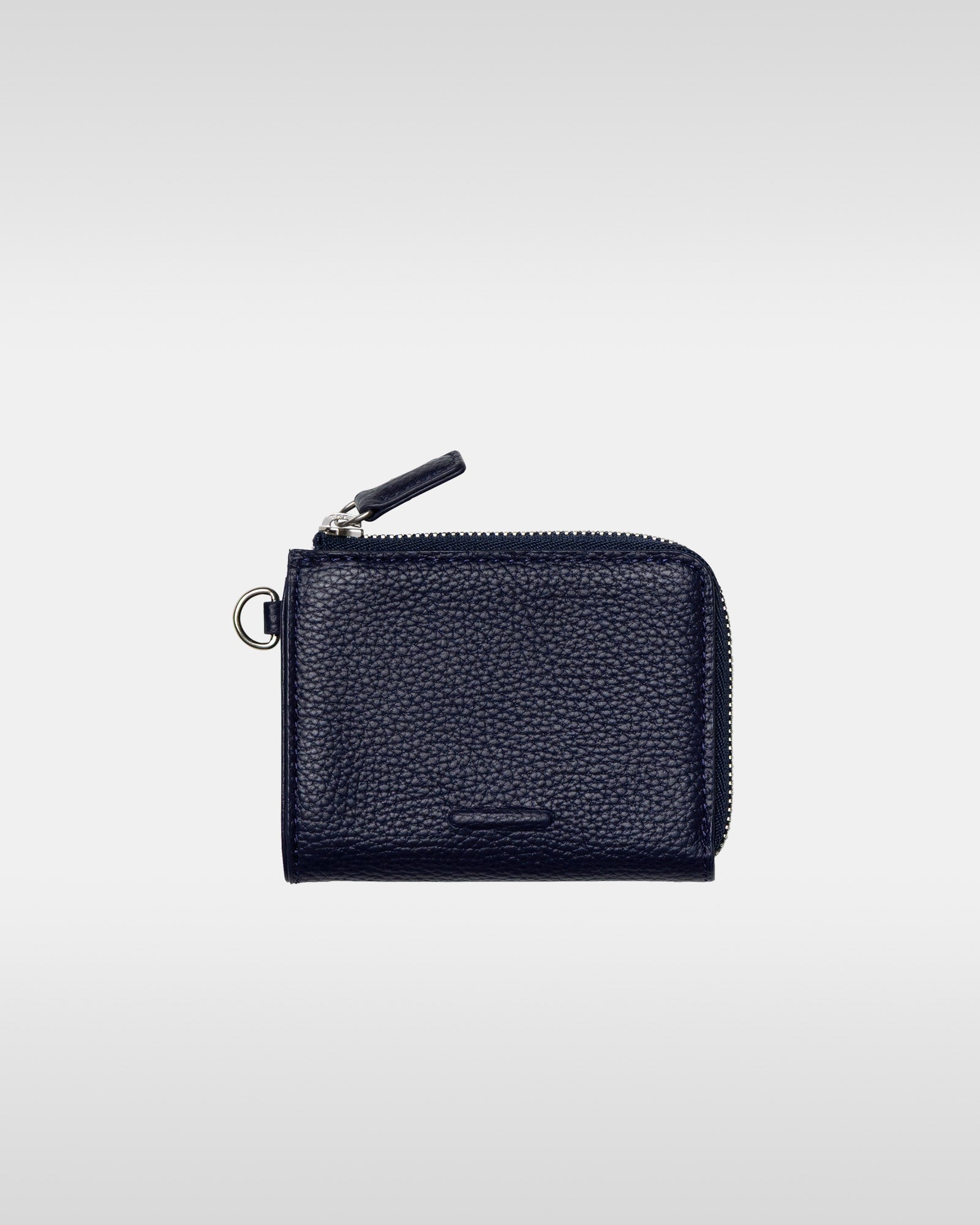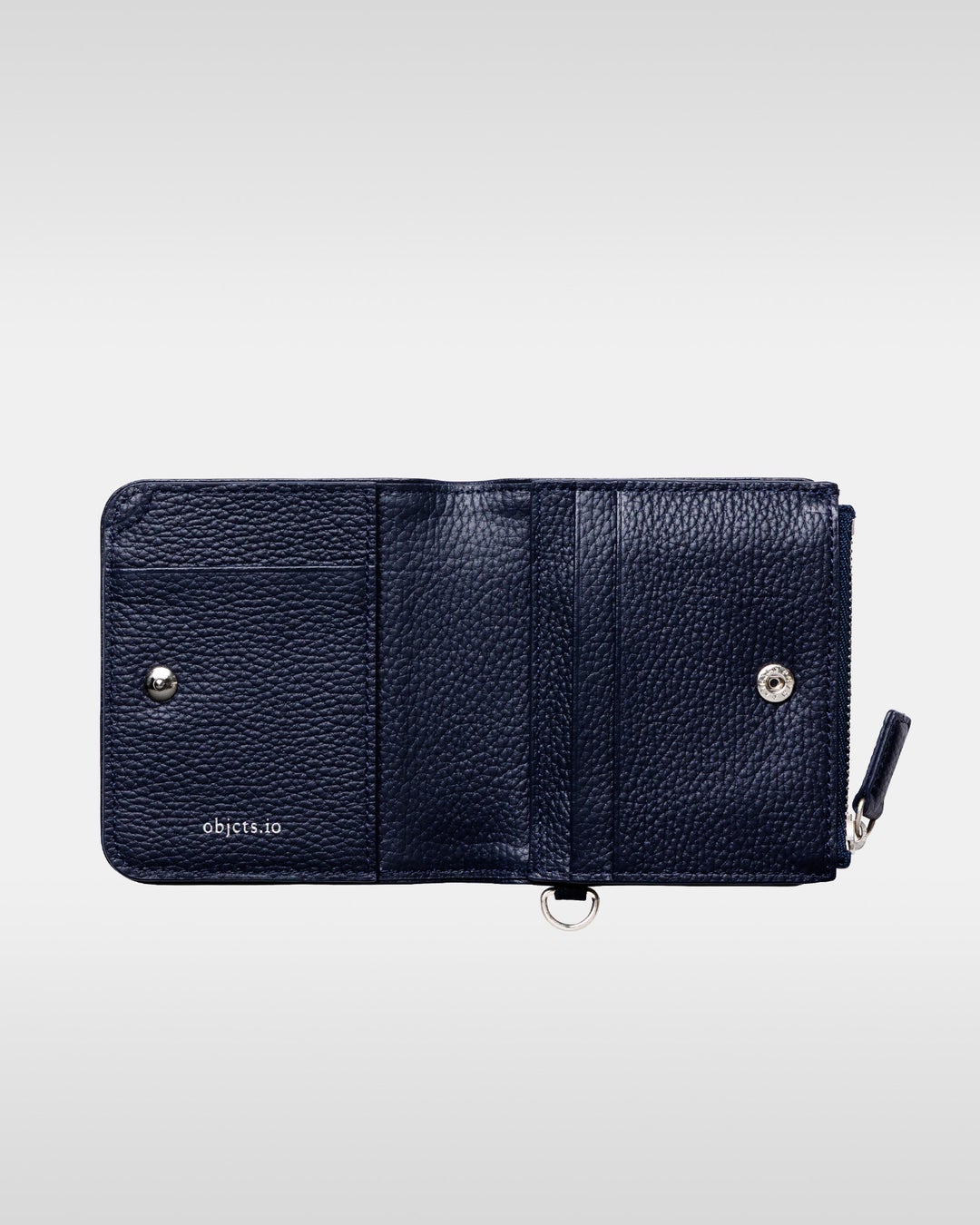 深みのあるネイビーが上質なレザーに映え、手元に品格を添えるコンパクトなスリムウォレット。カードと少額の現金をスマートに収納でき、最低限のアイテムだけでミニマルに外出したい日にも活躍します。