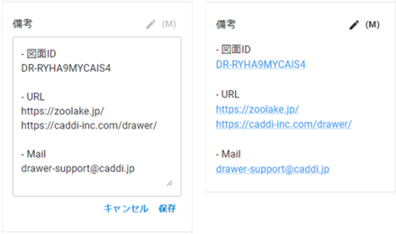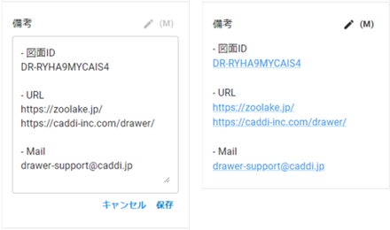 また従前より、備考欄に図面の関連情報を登録することが出来ましたが、テキスト情報のみに対応しており、利便性に課題がありました。今回、テキストをリンクで表示する機能を追加したことで、備考欄に含まれる図面ID、URL、メールアドレスはリンクで表示され、ワンクリックでアクセス出来るようになります。