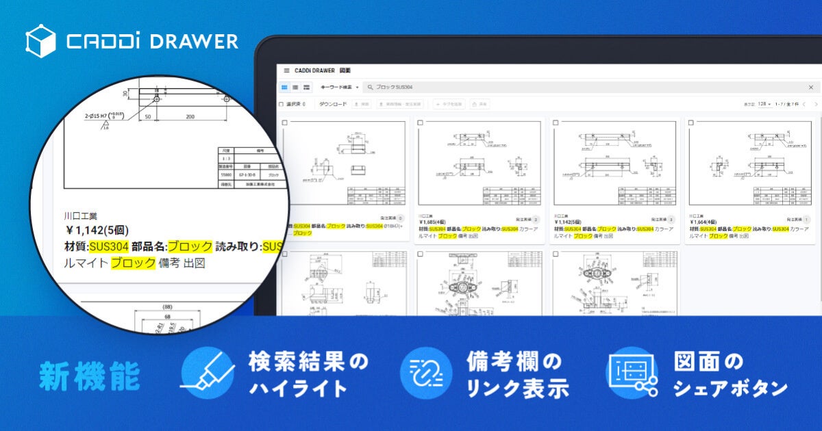 図面データ活用クラウド『CADDi DRAWER』新機能リリース 検索結果のハイライト、備考欄のリンク表示などを追加