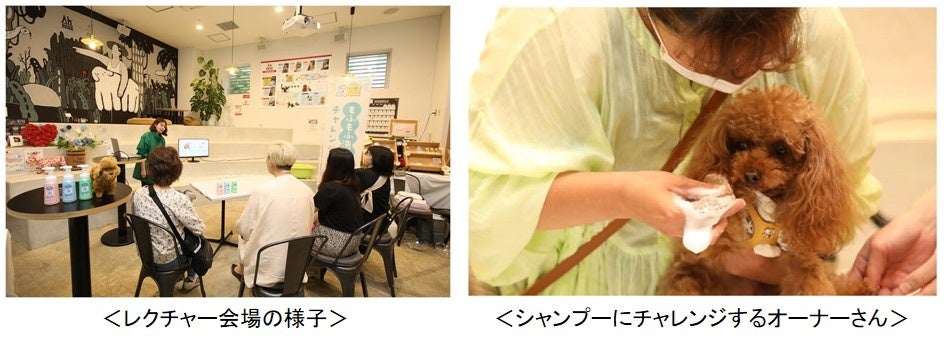 当日は弊社の愛玩動物看護師よりワンちゃんの皮ふに負担が少ない洗い方を実演しながらレクチャーしました。そのあと、レクチャーを受けたオーナーさんがトリマーさんのサポートを受けながら『ペットキレイ 泡リンスインシャンプー』を使って、ワンちゃんのシャンプーにチャレンジしました。参加されたオーナーさんからは「はじめから泡で出てくるので楽でした」、「目に入ると嫌がるが、泡なので垂れてこず顔まわりもキレイに洗えました」などといった声が寄せられ、今後実際にご自宅でもやってみようと思っていただけるよい機会となりました。