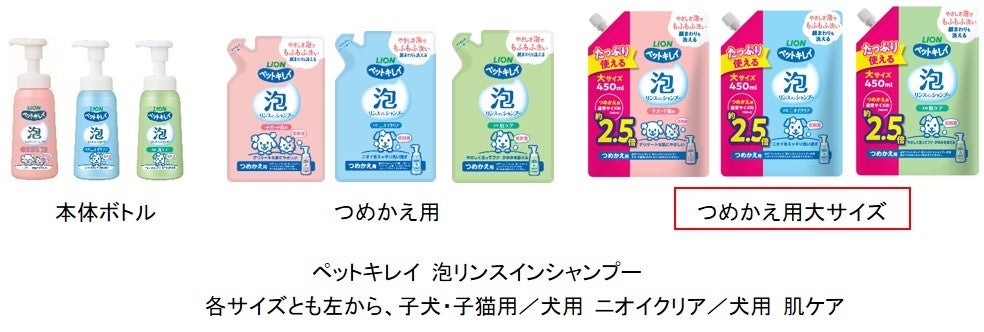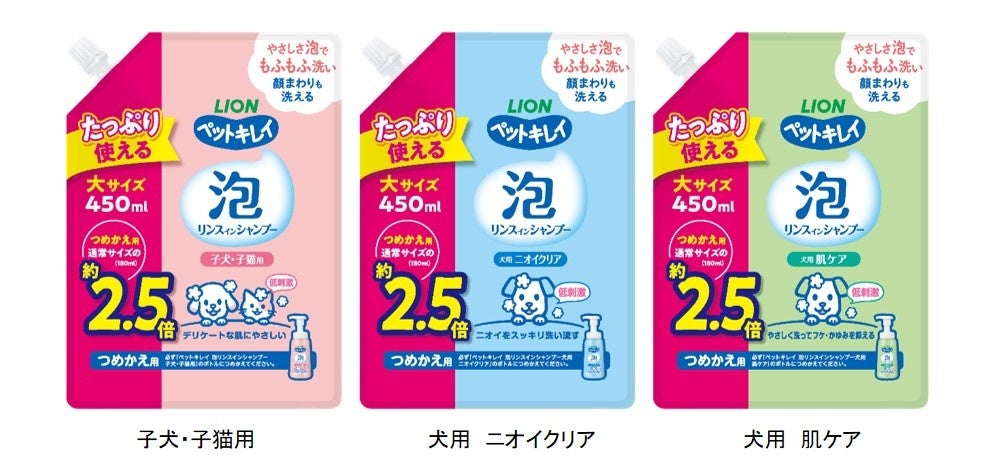 そこでこの度、つめかえ用通常サイズの約2.5倍容量でたっぷり使える『ペットキレイ 泡リンスインシャンプー つめかえ用大サイズ 子犬・子猫用/犬用 ニオイクリア/犬用 肌ケア』を新発売いたします。