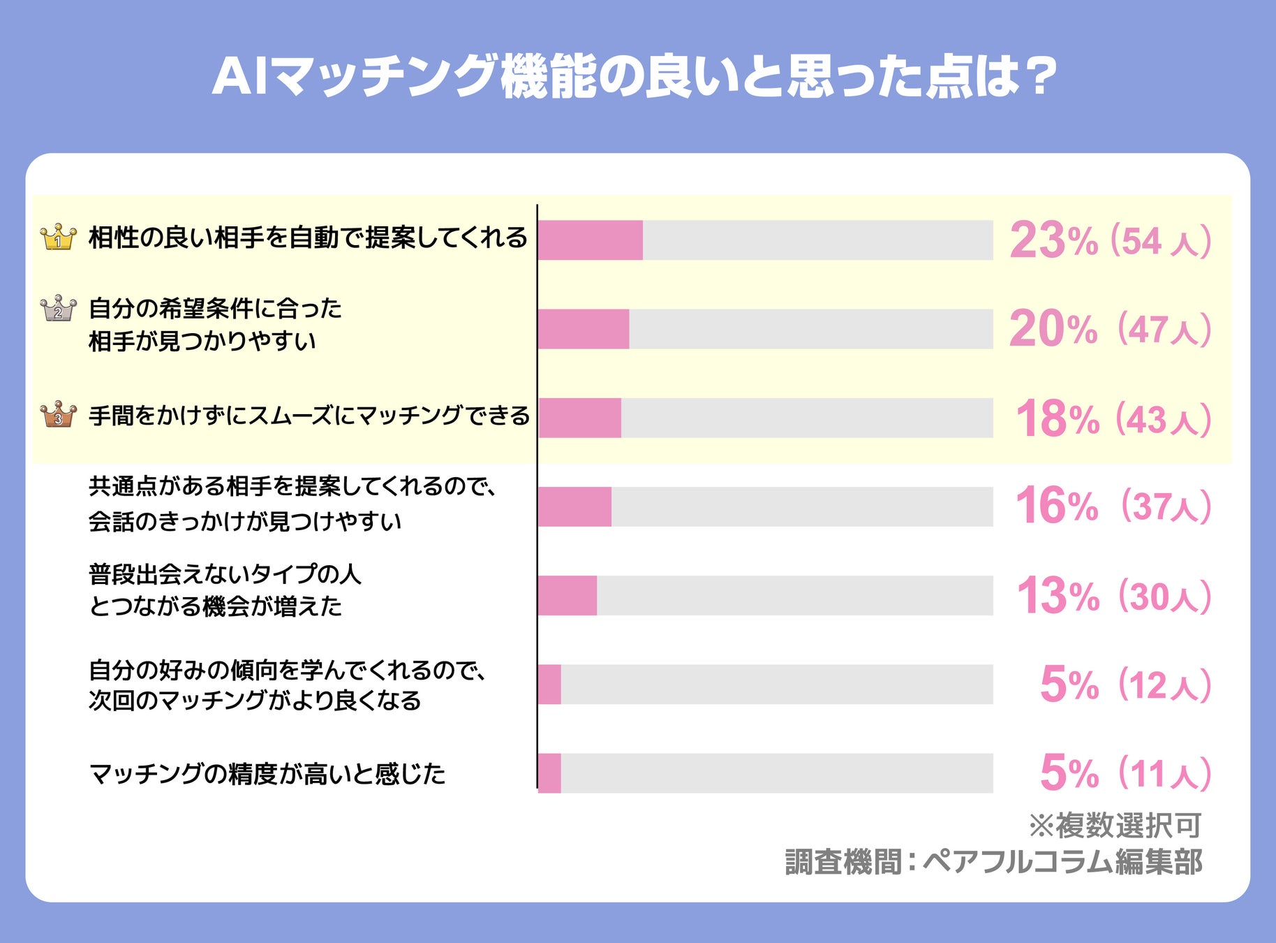 AIマッチング機能の良い点として「相性が良い相手を自動で提案してくれる」が23%、次いで「希望条件に合った相手が見つかりやすい」20%、「手間をかけずにスムーズにマッチングできる」18%と、利便性に関する意見が多く挙がりました。