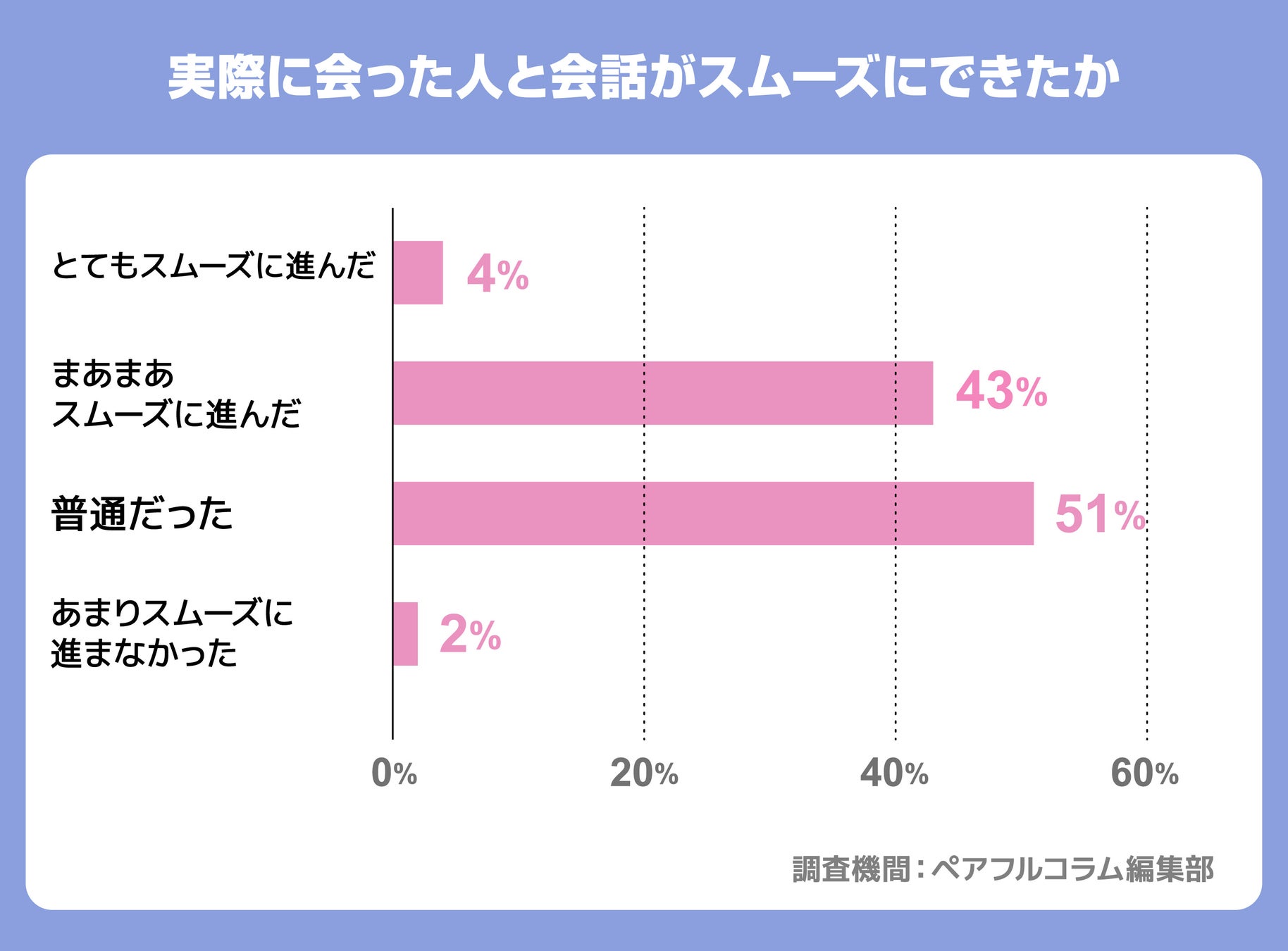 AIが選んだ相手と実際に会った人は、96%が会話のスムーズさを「普通」以上だと答えていました。そのうち「スムーズに進んだ」と答えた人が47%なので、会話しやすい相手と出会いやすいのがわかります。