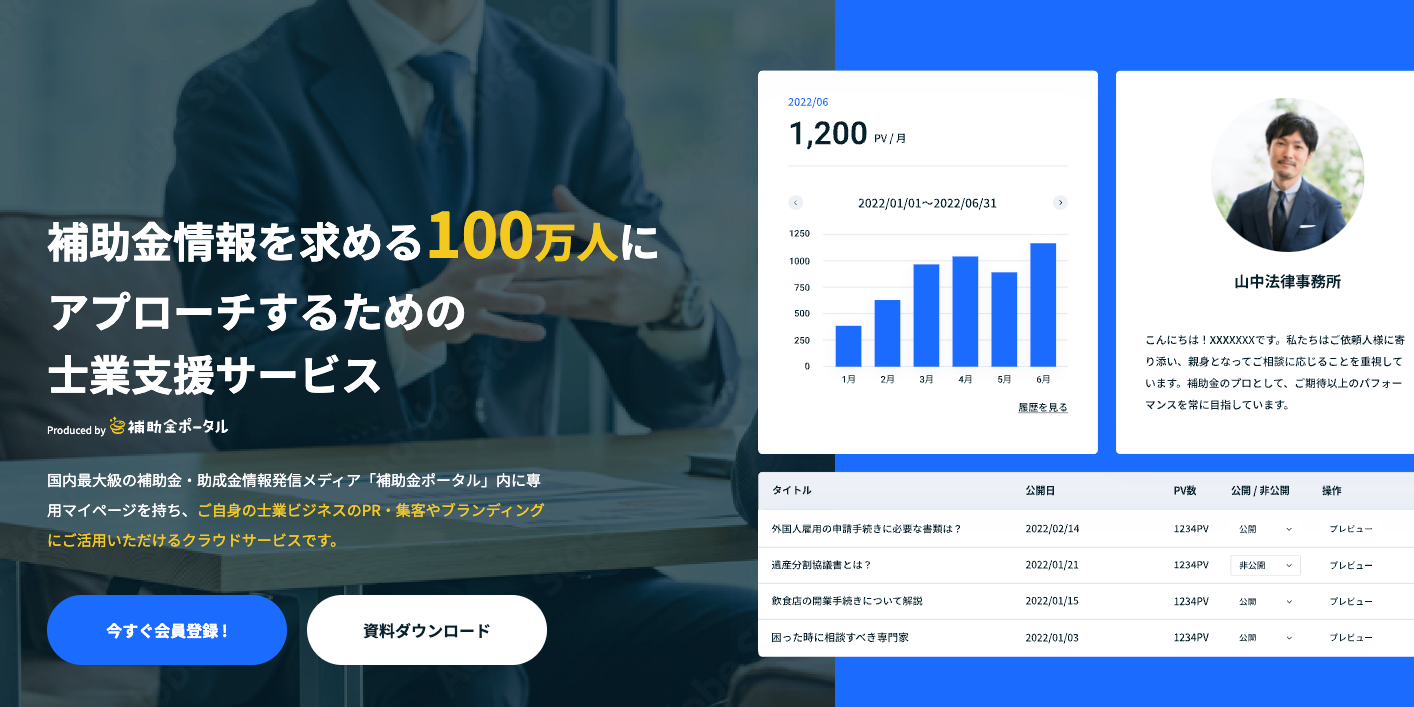 一方で、国内最大級の補助金・助成金情報Webメディアである補助金ポータルのドメインパワーを各士業の方が利用していただくことで、今までよりも圧倒的に早く情報を求めている企業ユーザーに情報をお届けすることが可能になります。