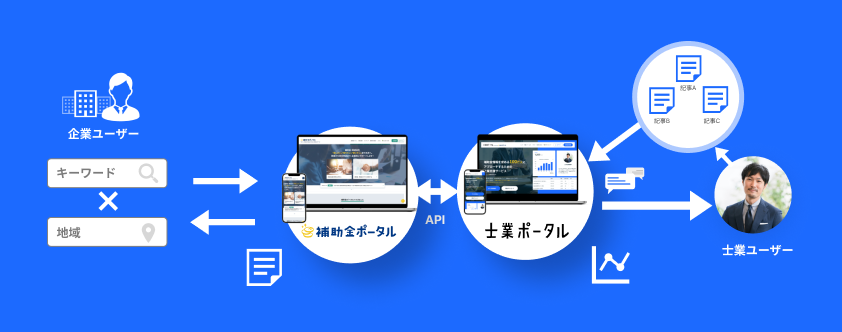 士業ポータルは、ご登録いただいた士業の方の情報や発信される情報が補助金情報感度の高いユーザーが集まる補助金ポータルに自動的に掲載される仕組みとなっています。また、企業ユーザーからは、お困りごとなどのキーワードや地域などによって該当する士業様を検索することができるプラットフォームとなっています。