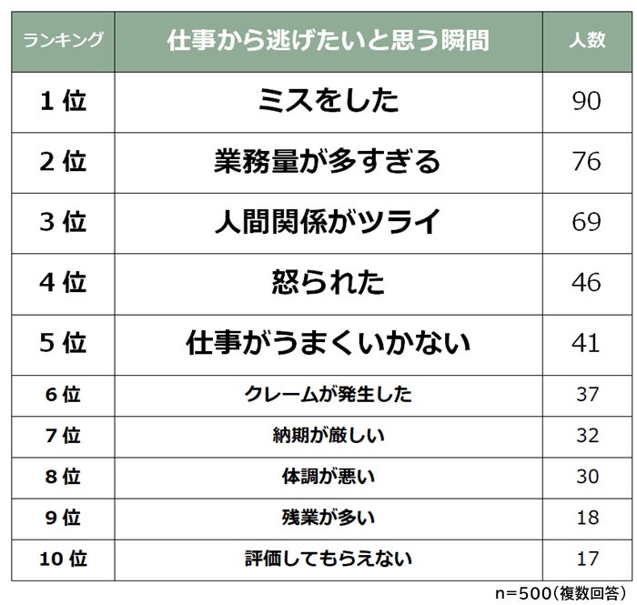 仕事から逃げたくなった経験がある500人にアンケートを行った結果、「仕事から逃げたくなるとき」第1位は「ミスをしたとき」でした。