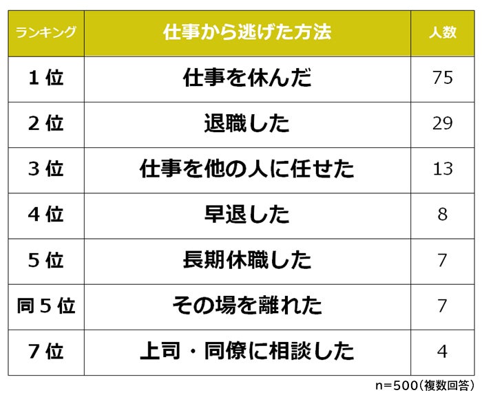 ・仕事から逃げた方法1位は「仕事を休んだ」