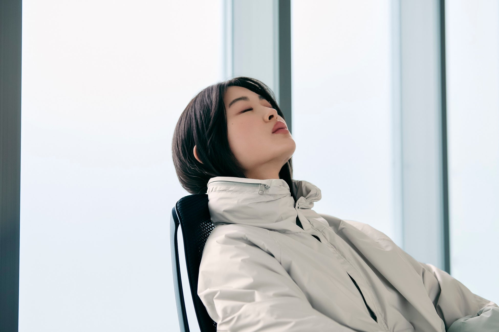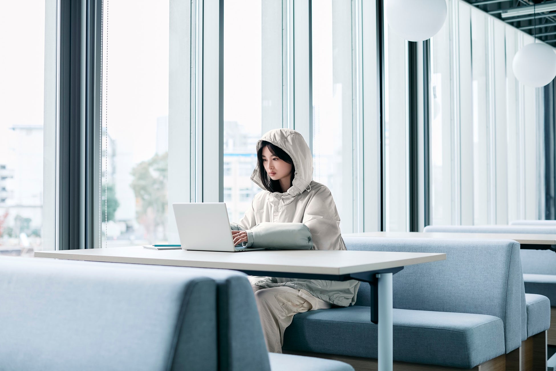 POINT④:「フード」を被ることで集中しやすい視界になるように設計。休憩時はたたんで収納し「ネックピロー」にも。