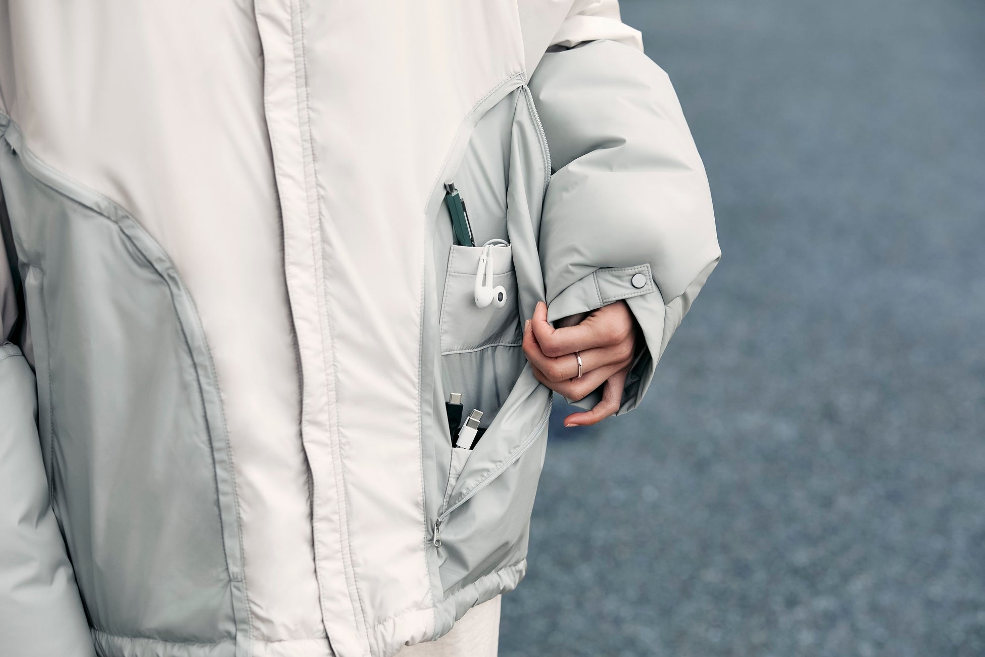 数々の案をもとに開発された「CAMPUS WEAR」のモデルデザインが「CUSHION JUMPER」です。外して使うこともできる背中と腕のクッションが、長時間のパソコン作業をサポートし、ネックピローにもなる収納式フードは、被ることで集中しやすい視界になるように設計。細かなものを分別して収納できるインナーポケットには、イヤホンや充電器などの周辺機器をいれることができます。「大学のイスは硬い」「手や腰が痛くなる」「持ち運びに疲れる」などの声を元に、がんばる大学生にとって必要な機能が備わりました。