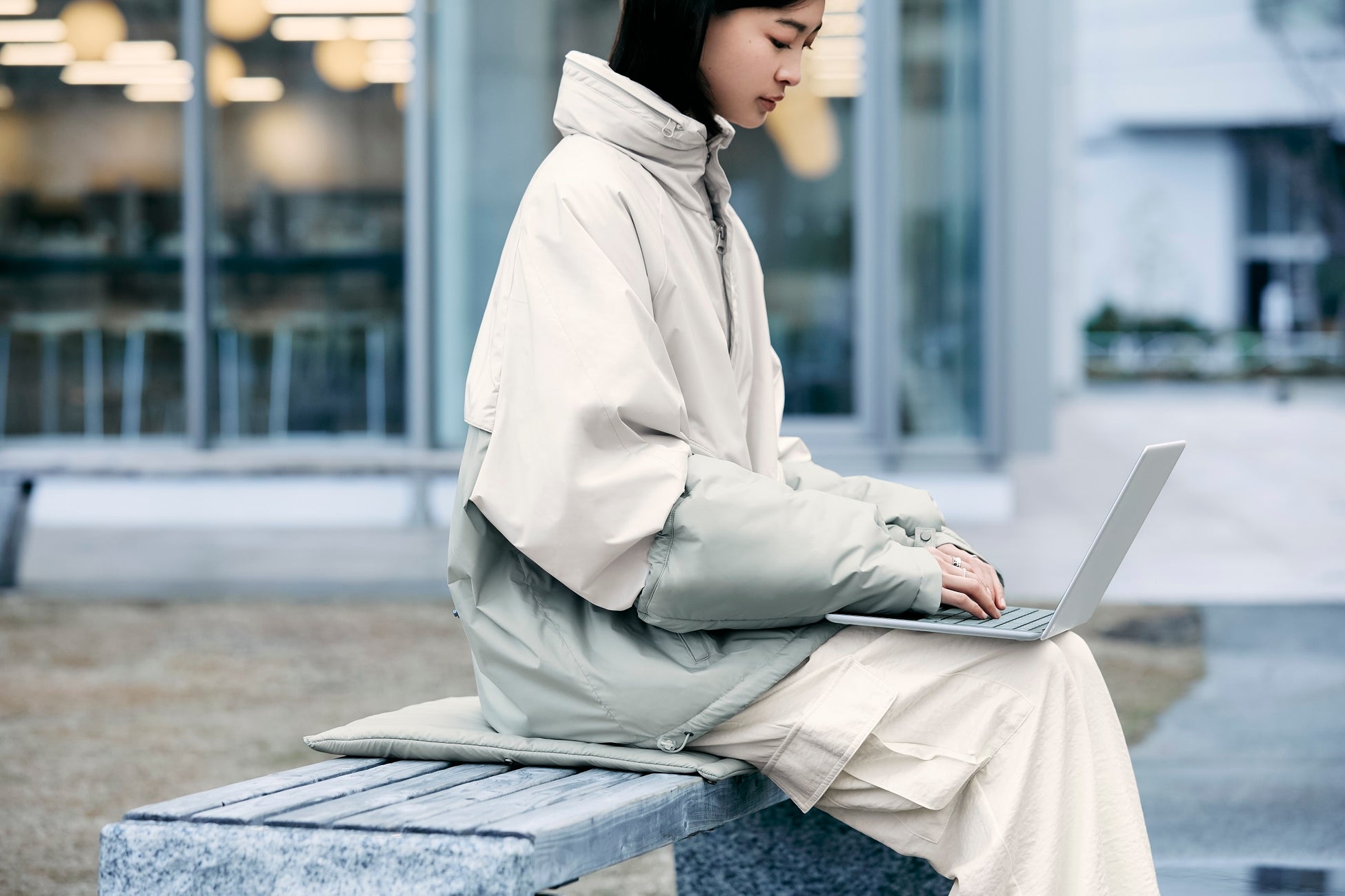 「CUSHION JUMPER」は、キャンパスでのパソコン作業にも心地よく集中できるクッションつきのジャンパーとなっており、つらいパソコンでの作業時間を心地よくするための様々な工夫が凝らされています。
