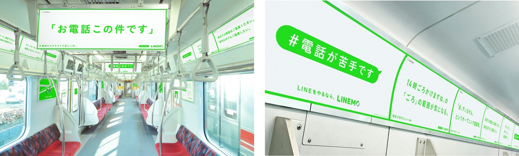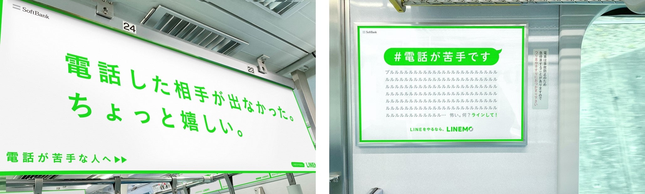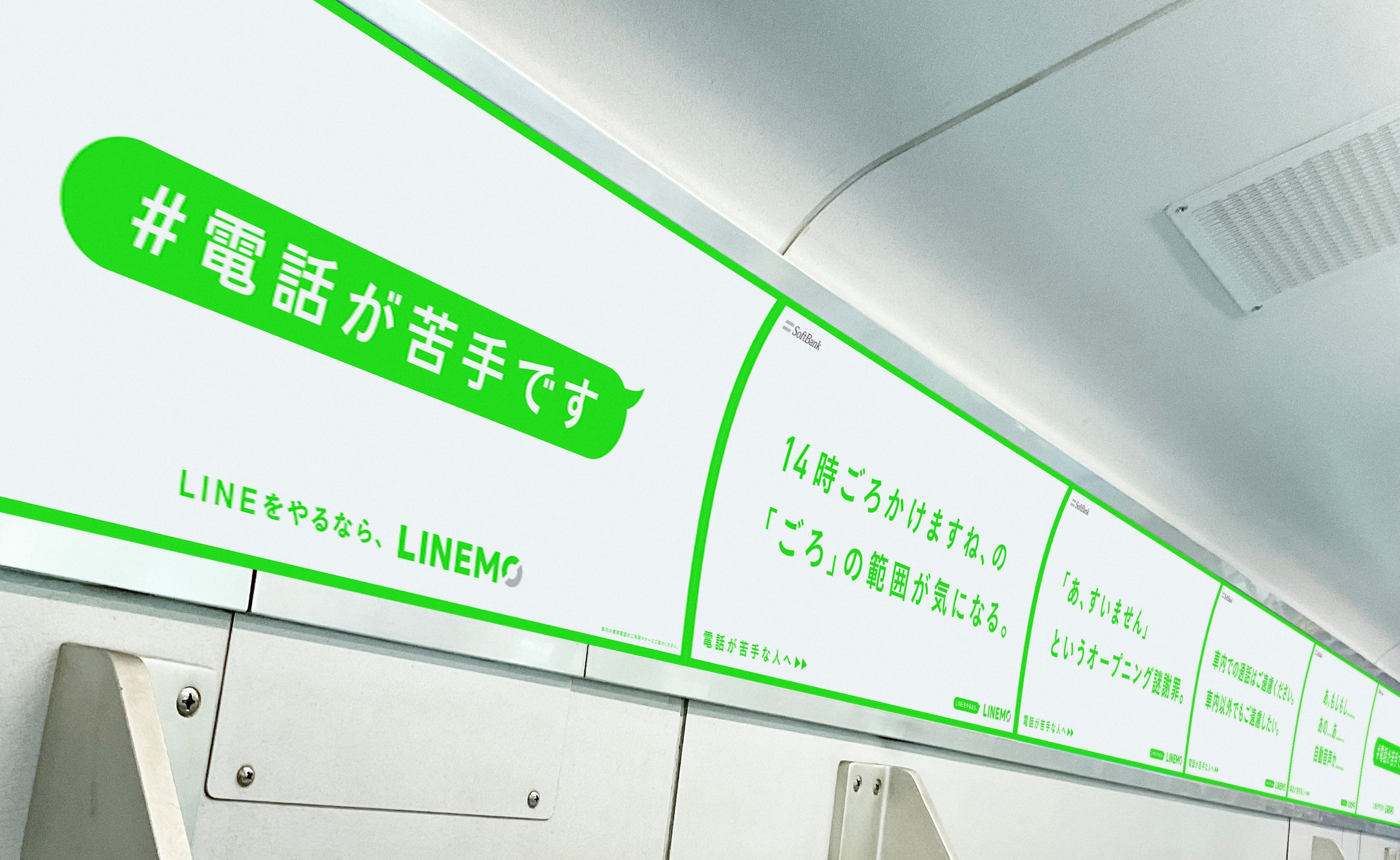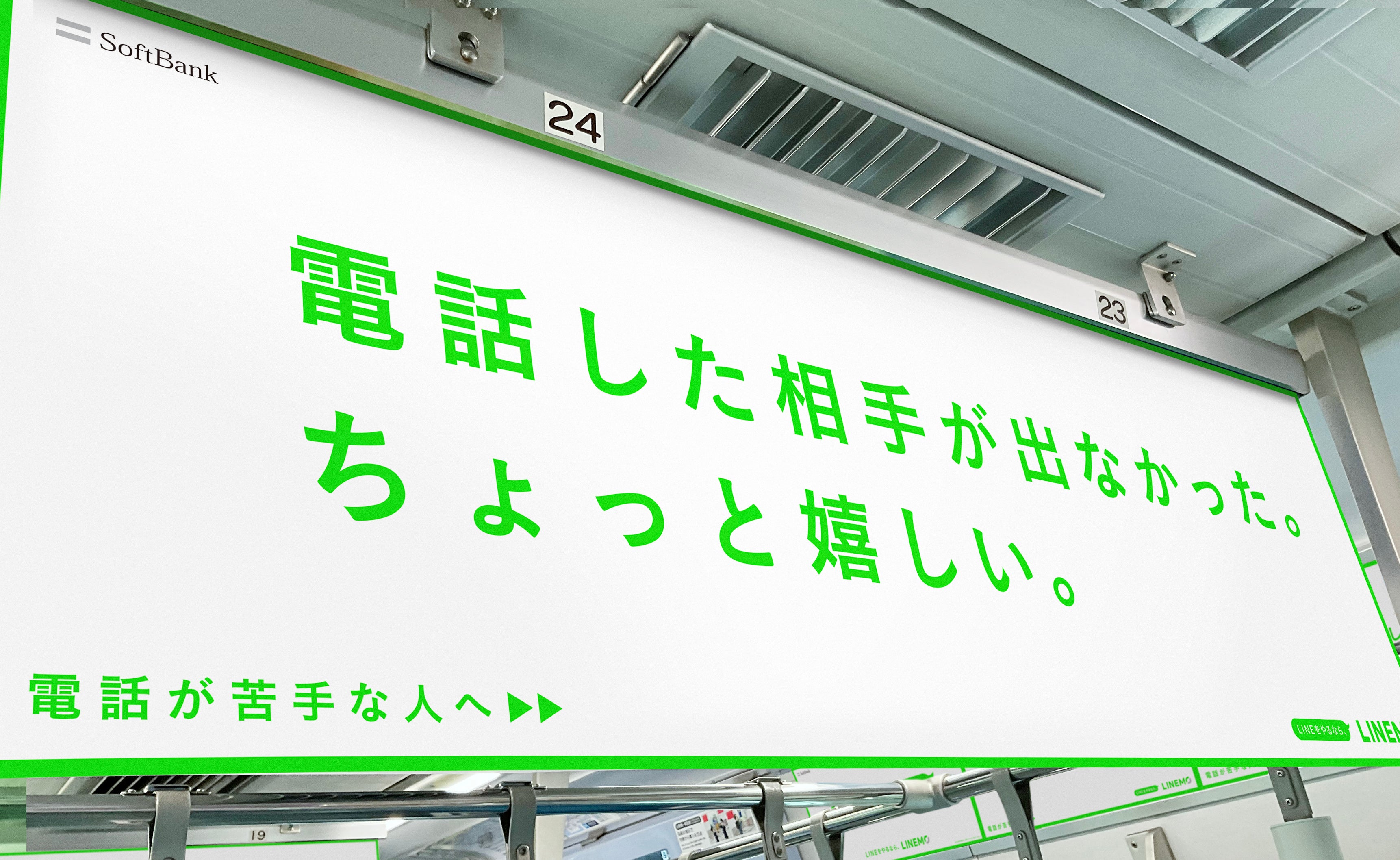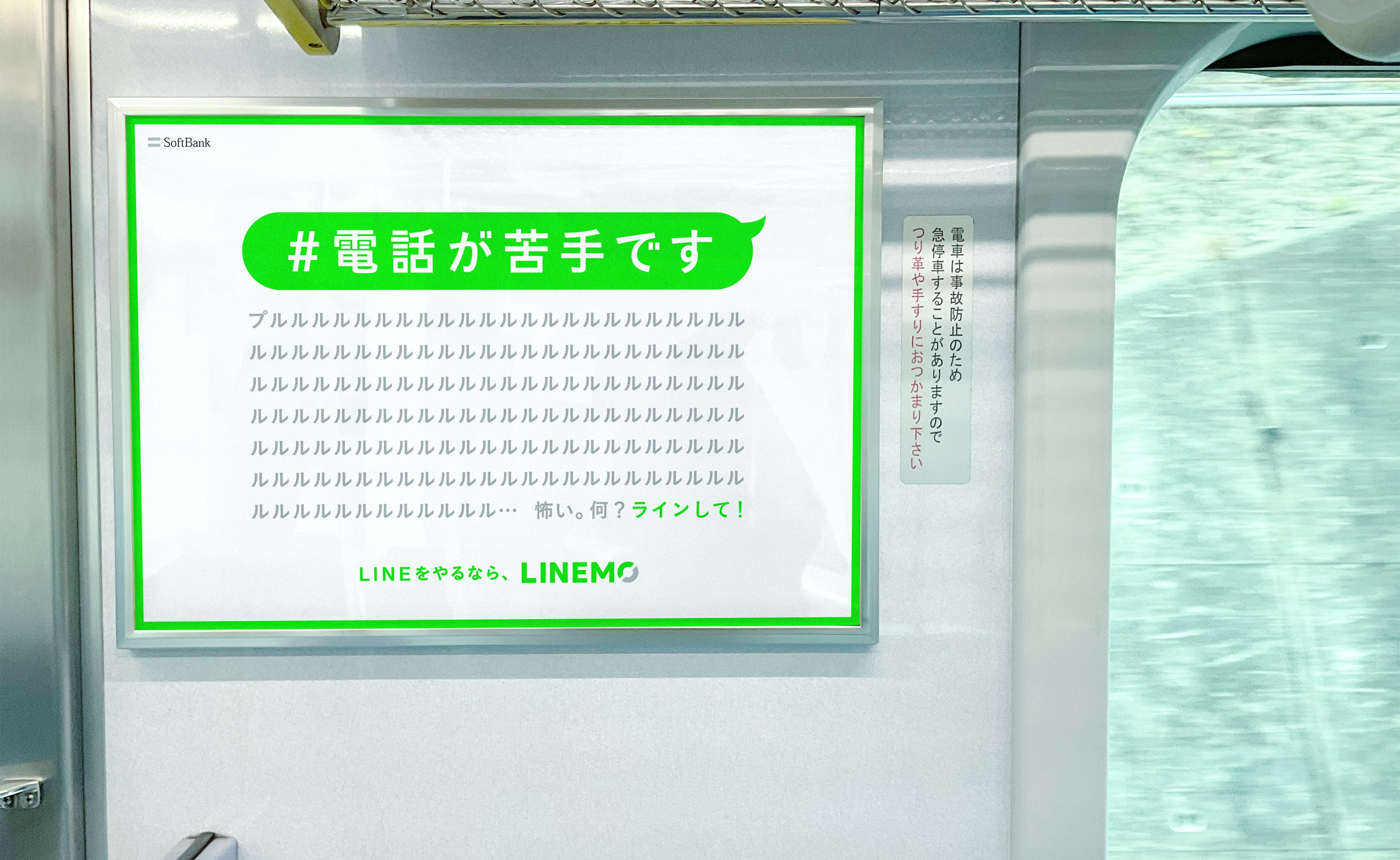 新生活を目前にした3月16日(土)から、東急東横線・田園都市線で電車ジャック広告を掲出します。電話が苦手な人に向けて共感していただけるようなあるあるを軸にクリエイティブを作成しました。「14時頃かけますね、の「ごろ」の範囲が気になる。」や、「電話した相手が出なかった。ちょっと嬉しい。」といった電話が苦手な人が一度は感じたことのある内容となっています。ぜひ、運行期間中にご覧ください。