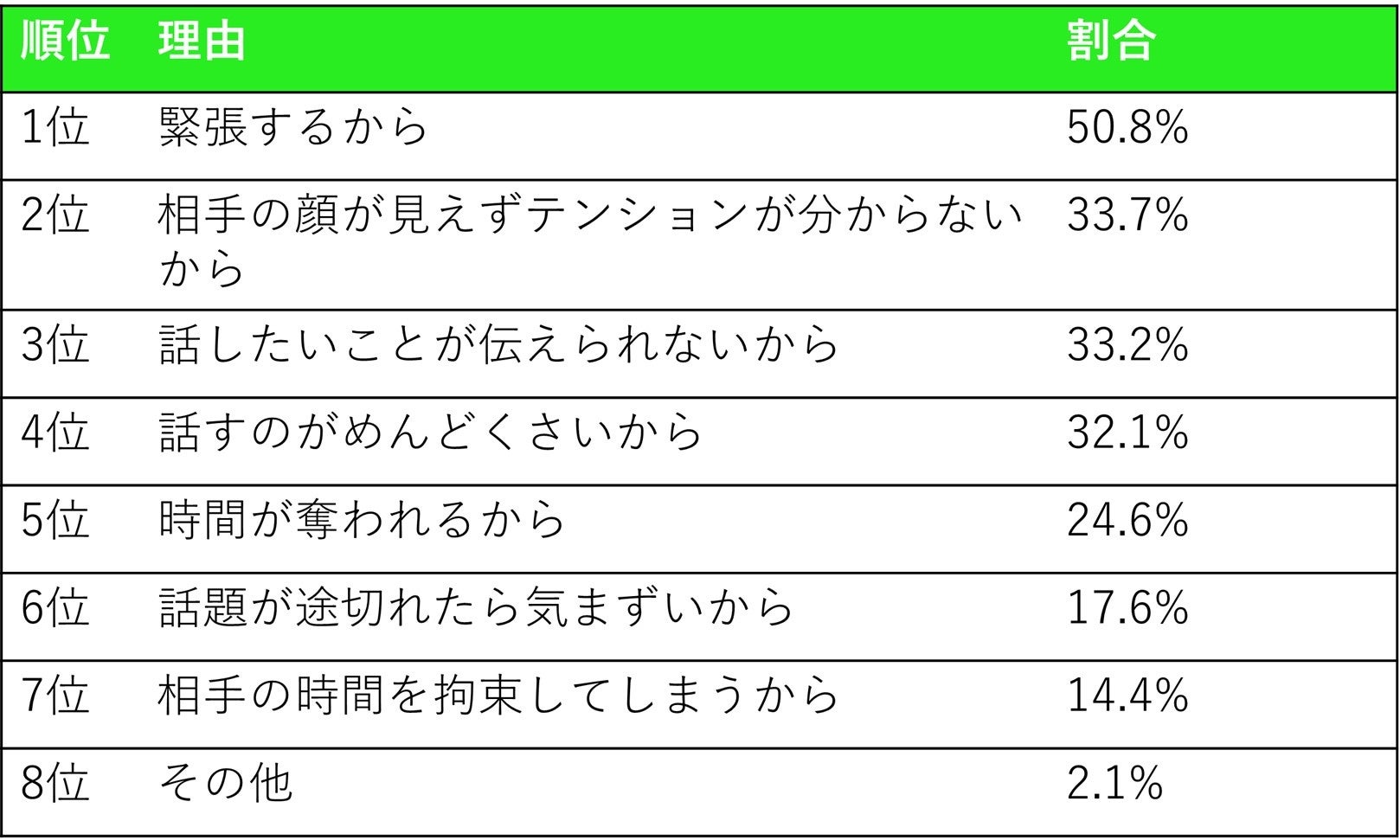 電話が苦手な理由には「緊張するから」が半数を占め、最も高いという結果に。その他にも、「話したいことが伝えられないから」、「相手の顔が見えずテンションがわからないから」といったリアルタイムで話さなくてはいけない電話だからこそのポイントに苦手な理由が集まりました。