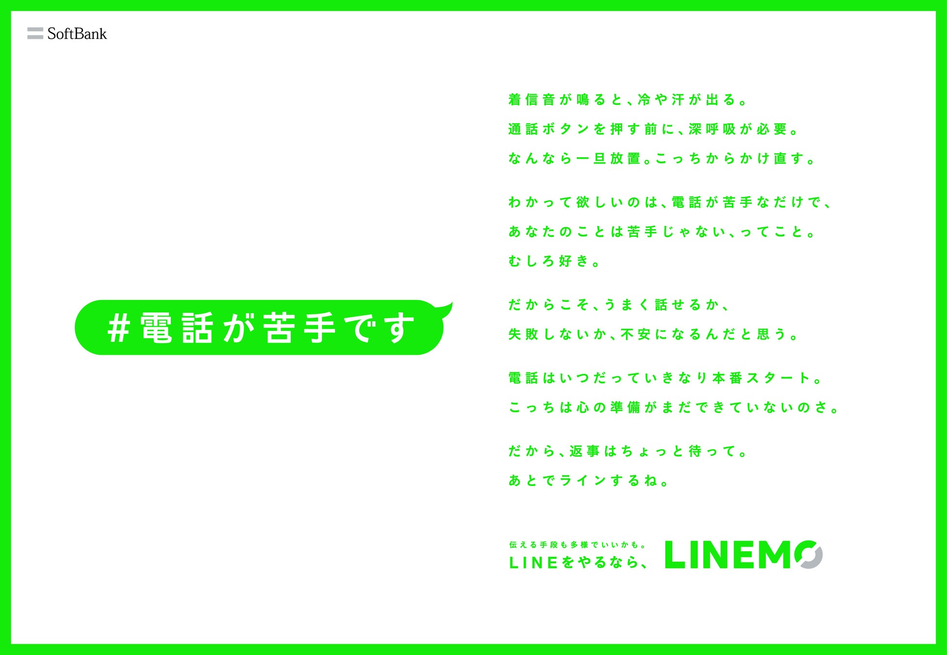 ソフトバンク株式会社(以下「ソフトバンク」)は、オンライン専用ブランド“LINEMO(ラインモ)”において、新生活シーズンに合わせて、電話が苦手な若者を応援するプロジェクト「#電話が苦手です」を2024年3月16日(土)から開始します。