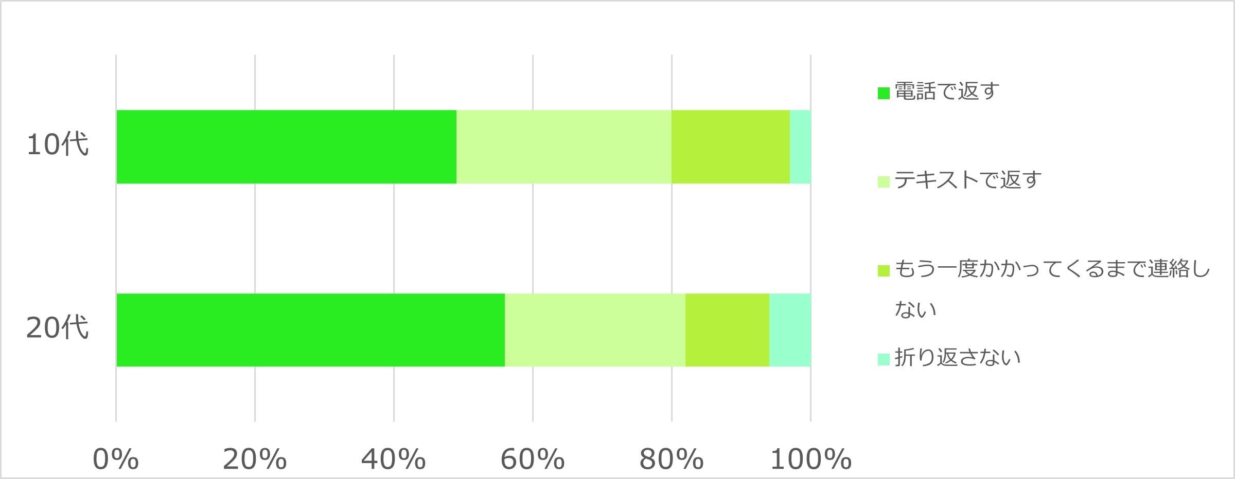 若者のうち約半数が、電話が来ても折り返しをせずテキストコミュニケーションや、もう一度着信があるまで連絡しないという結果が明らかになりました。電話だと相手の都合の良いタイミングが分からない、相手のテンションや要件が分からず連絡をためらってしまうと考察できます。