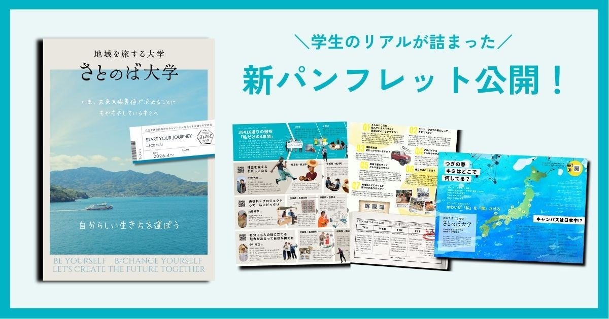 地域を旅する大学 さとのば大学(運営:株式会社アスノオト 代表取締役:信岡良亮、所在地:東京都千代田区、以下当社)は、このたび大学案内パンフレットを全面リニューアルいたしました。今回のパンフレットでは、「自分らしい生き方を選ぶ旅」をコンセプトに、さとのば大学ならではの教育理念やカリキュラムの内容に加え、学生のリアルな学びと暮らしの4年間を伝えています。