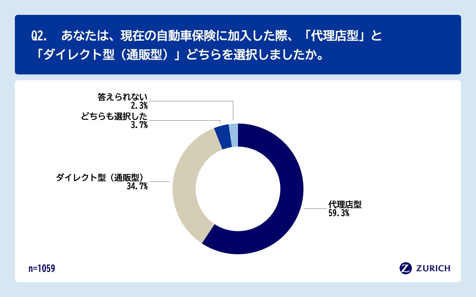 「Q2.あなたは、現在の自動車保険に加入した際、「代理店型」と「ダイレクト型(通販型)」どちらを選択しましたか。」(n=1059)と質問したところ、「代理店型」が59.3%、「ダイレクト型(通販型)」が34.7%という回答となりました。