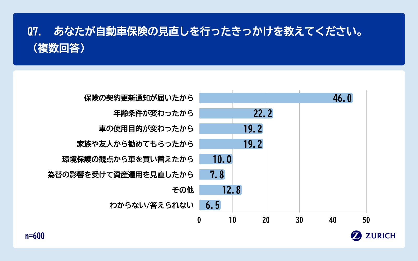 Q6で「2社」「3社」「4社以上」と回答した方に、「Q7.あなたが自動車保険の見直しを行ったきっかけを教えてください。(複数回答)」(n=600)と質問したところ、「保険の契約更新通知が届いたから」が46.0%、「年齢条件が変わったから」が22.2%、「車の使用目的が変わったから」が19.2%、「家族や友人から勧めてもらったから」が19.2%という回答となりました。