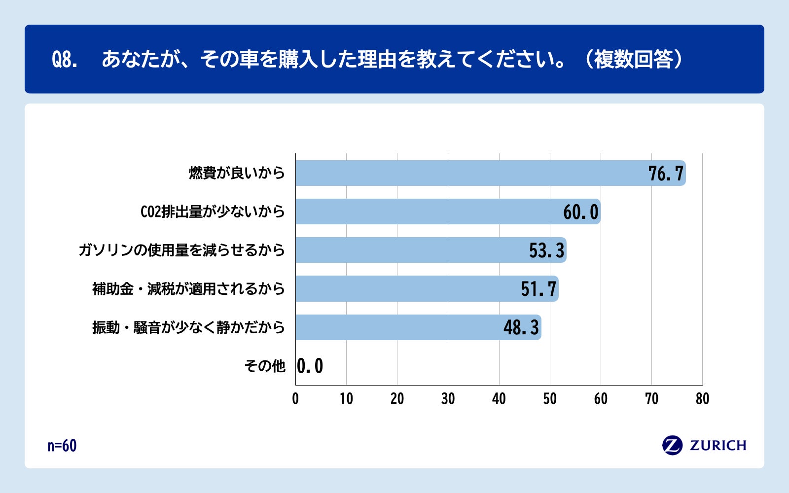 Q7で「環境保護の観点から車を買い替えたから」と回答した方に、「Q8.あなたが、その車を購入した理由を教えてください。(複数回答)」(n=60)と質問したところ、「燃費が良いから」が76.7%、「CO2排出量が少ないから」が60.0%という回答となりました。