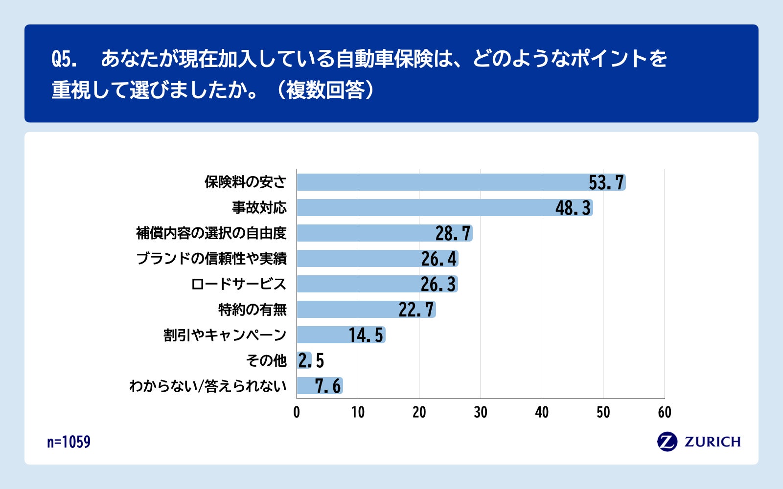「Q5.あなたが現在加入している自動車保険は、どのようなポイントを重視して選びましたか。(複数回答)」(n=1059)と質問したところ、「保険料の安さ」が53.7%、「事故対応」が48.3%、「補償内容の選択の自由度」が28.7%という回答となりました。