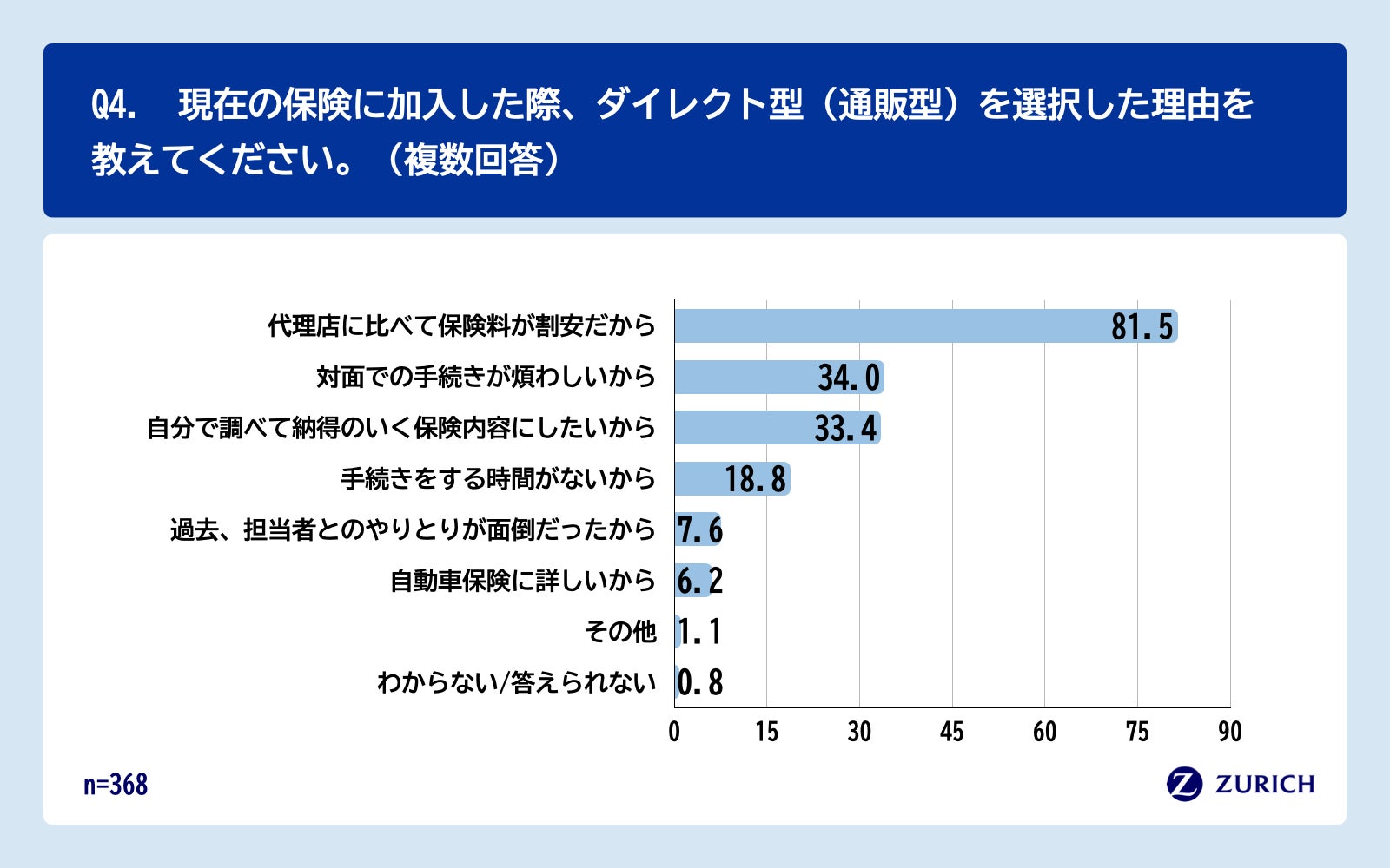 Q2で「ダイレクト型(通販型)」と回答した方に、「Q4.現在の保険に加入した際、ダイレクト型(通販型)を選択した理由を教えてください。(複数回答)」(n=368)と質問したところ、「代理店に比べて保険料が割安だから」が81.5%、「対面での手続きが煩わしいから」が34.0%、「自分で調べて納得のいく保険内容にしたいから」が33.4%という回答となりました。