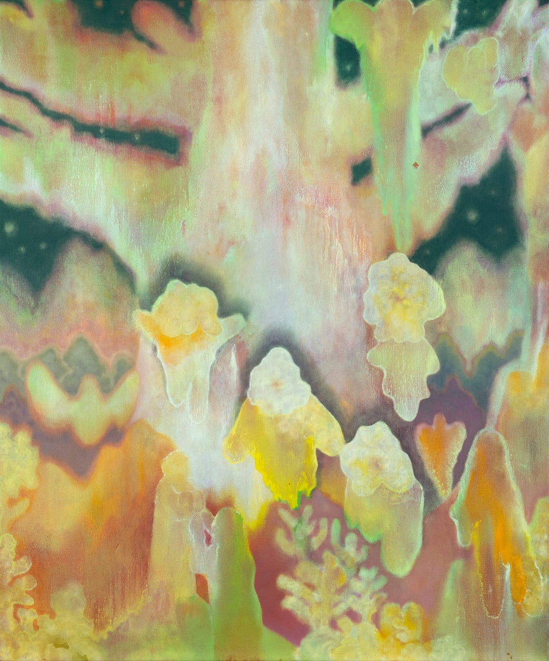 生物の幼生や幼体、植物の新芽や花などを描いている。成体になる前の柔らく曖昧なその段階は「これから」どのような形になるのかを想像させる存在でもある。また、絵を描く過程で発生する油絵具の滲みや掠れが、何かに見えそうと想像することも画面の「これから」を意識する行為である。何になるかわからない存在、あやふやな輪郭、絵具の変化、それらが絵画の中で浮遊し漂いながら、少しずつ形が浮かび上がってくる。そしてそれらが組み合わさり、ここではないどこか遠くの向こう側の景色になったとき、「これから」を想像させる絵画になるのではないかと思っている。