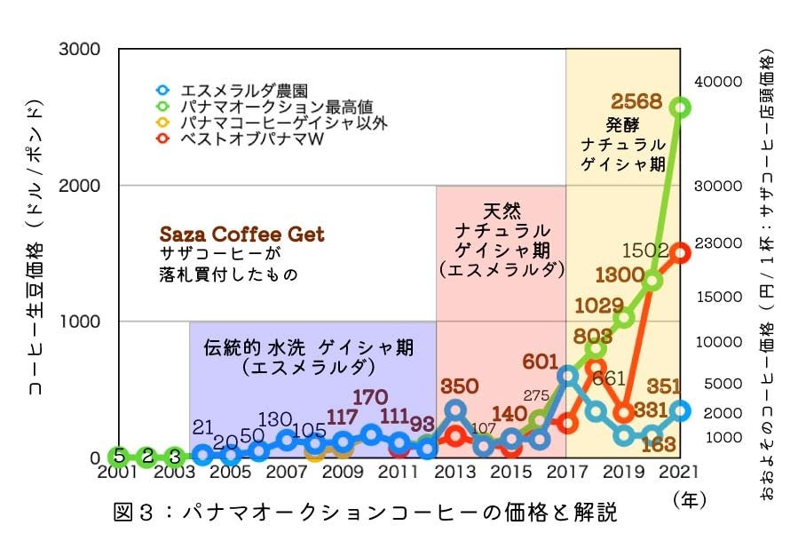 サザコーヒーは、「エスメラルダ農園のゲイシャ」を2009年のオークションではじめて117ドルで落札した。ゲイシャといえば「エスメラルダ農園」は重要で、2004年にゲイシャ品種のおいしさを発表し品評会で優勝してから2017年までゲイシャコーヒーの品質も価格を支配していた。ゲイシャが発見された2004年にパナマにはコーヒーの種子だけを果実から取り出す「水洗式精製」しかなかったが。しかし2013年にエスメラルダ農園は品質管理の難しい果実をそのまま干す「ナチュラル精製」をはじめ2017年まで価格と品質を支配した。2018年から2022年の今日までワインなどの果実酒のように果実を無酸素状態で窒息させて酵母菌などを添加して味付けする「発酵を伴う精製」が主流になっている。
