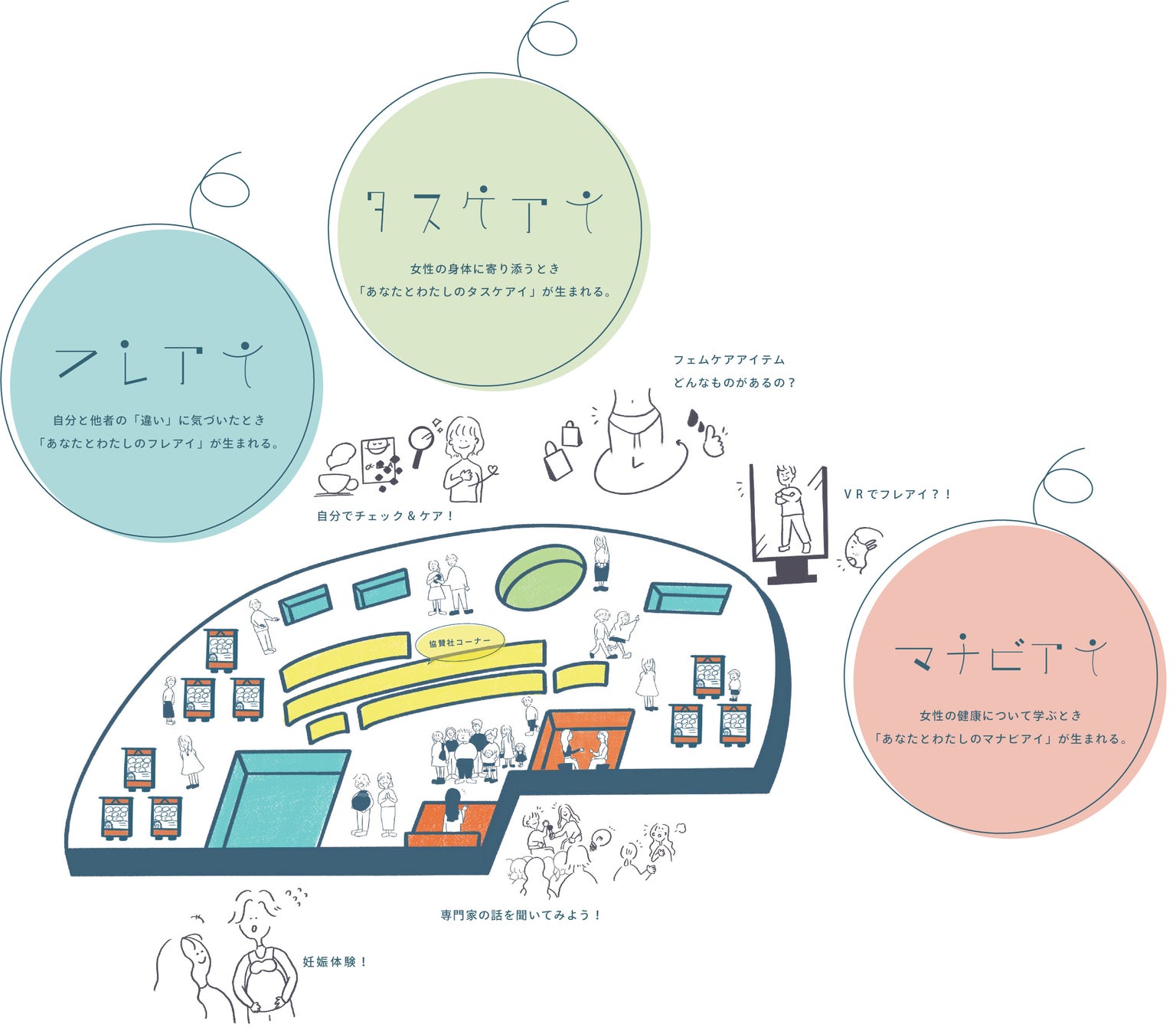 本イベントでは、女子大学生が考えたフェムケアを「フレアイ」、「タスケアイ」、「マナビアイ」の3つのセクションでご紹介します。H.U.POCkeTは「フレアイ」スペースに出展し、検査キットについて女子大学生が感じた「オモイ」とともに、子宮頸がんの原因となるヒトパピローマウイルス(HPV)の検査キットや歯周病リスク検査キット、骨粗しょう症リスク検査キットを展示するほか、模型による乳がんの触診体験も実施します。