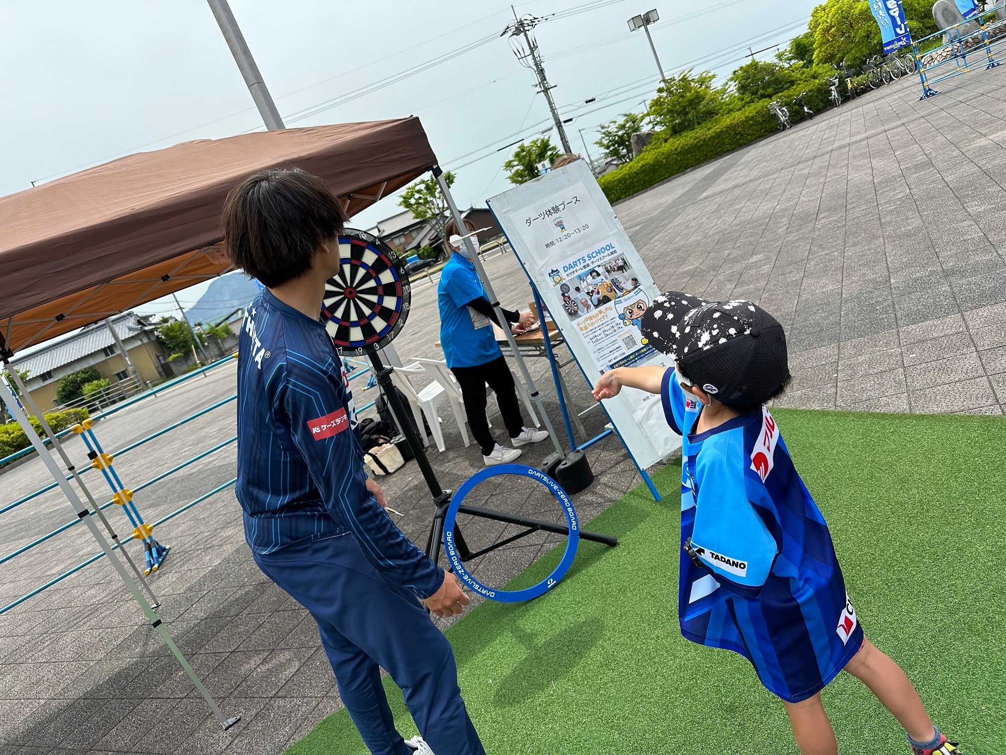 5月27日(土)のホーム戦でもダーツ体験会を開催。本スクールで講師を務める鈴木選手とカマタマーレ讃岐の竹村俊二選手がブースに立ち、お子様からシニアまで多くの方がダーツを楽しみました。