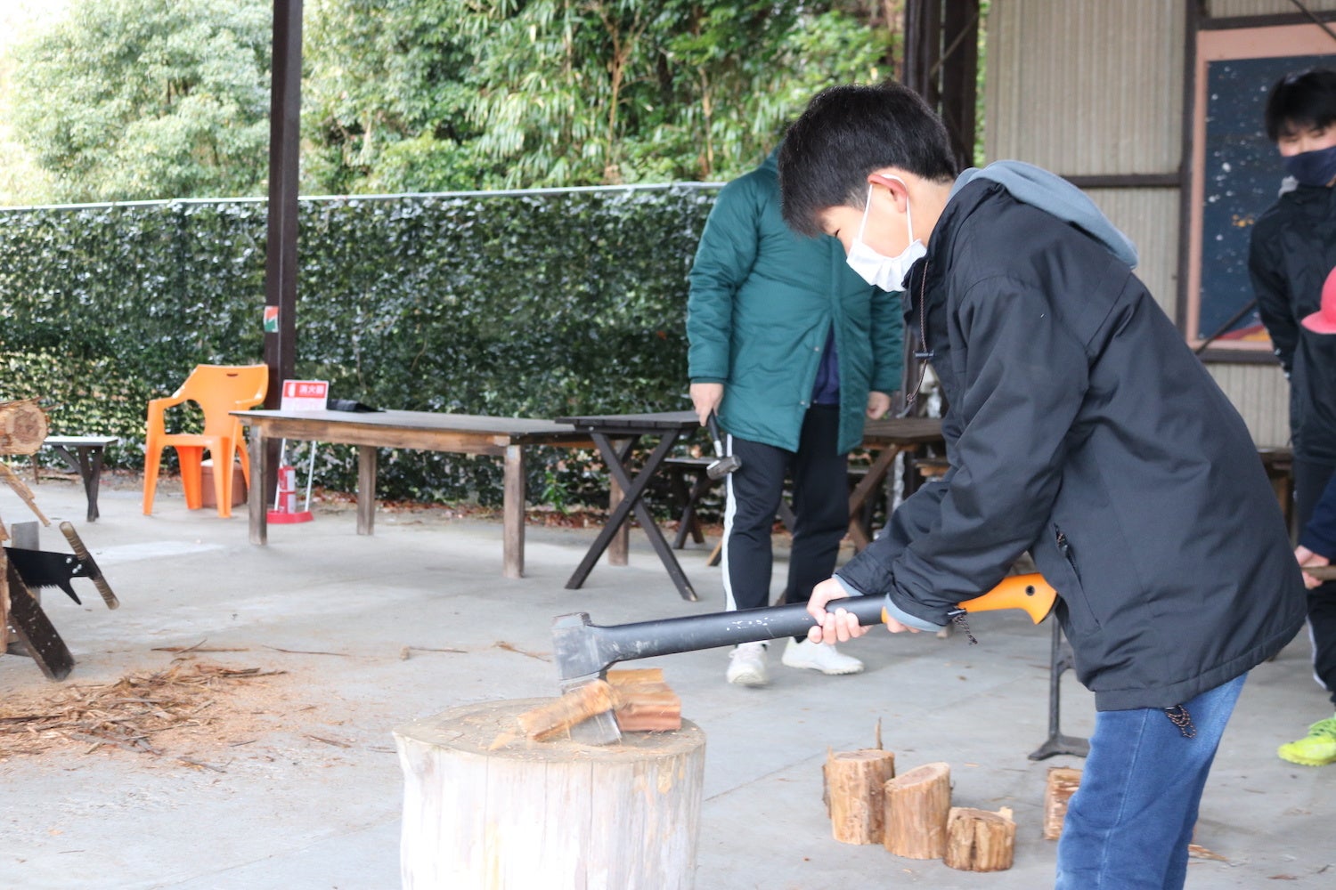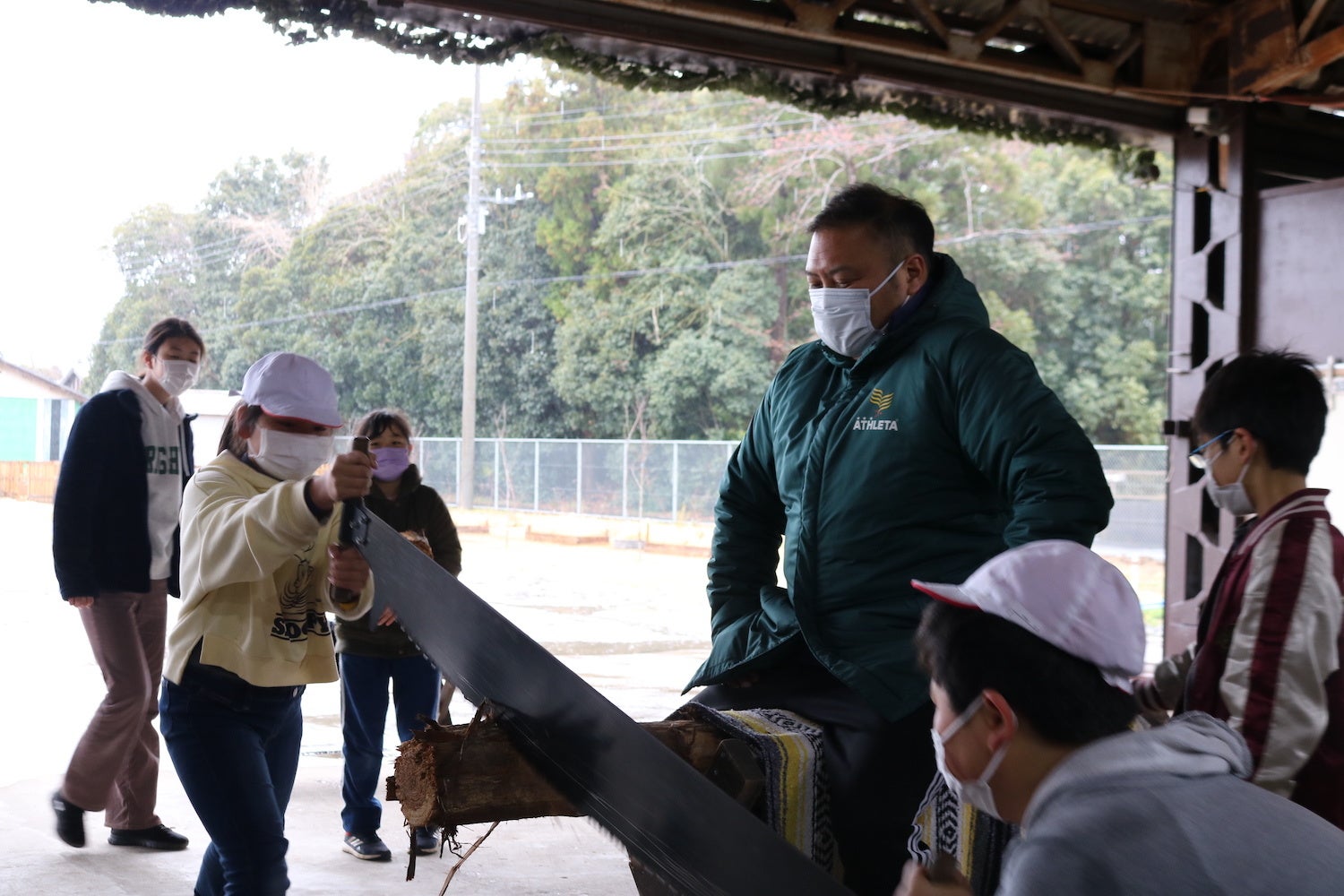 三年前の台風15号によって周辺地域で倒壊してしまった杉の木を活用し、自然の資源の大切さを学べる体験。巨大ノコギリで丸太を切っていくときには、チーム戦で速さを競争した。