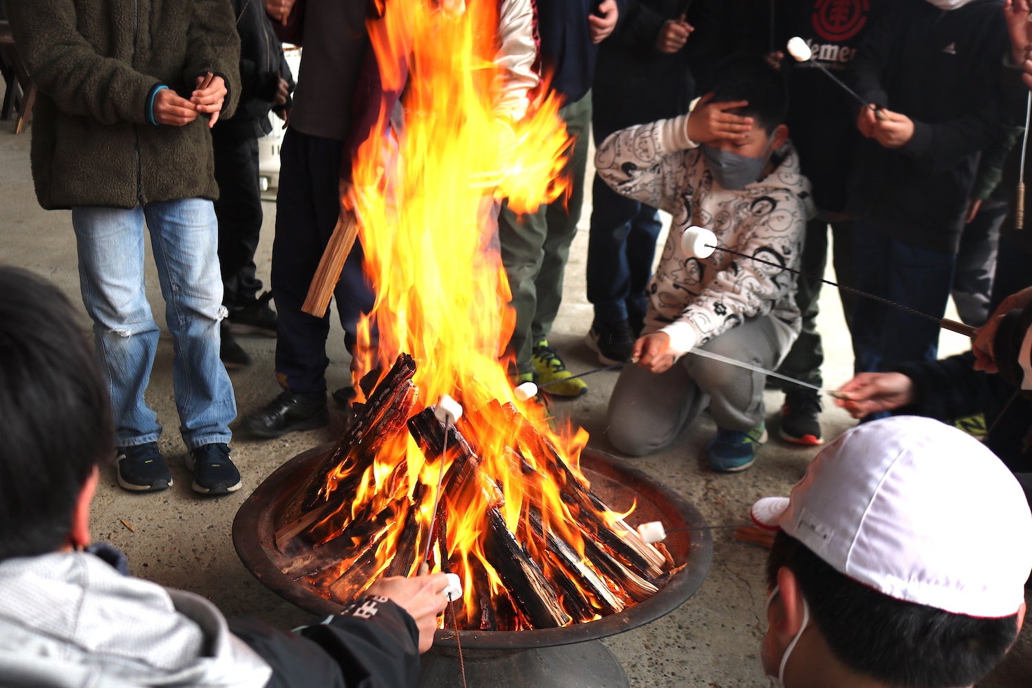 作った薪をくべて、焚き火を作る。最後にはお楽しみのマシュマロ焼きの体験を実施。