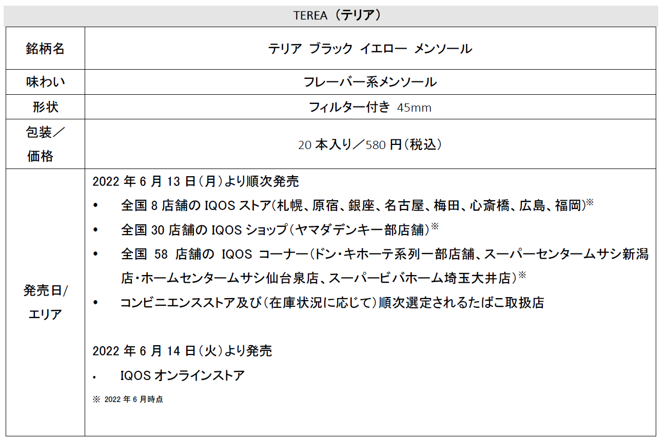フィリップ モリス ジャパン合同会社(本社:東京都千代田区、社長:シェリー・ゴー、以下「PMJ」又は「当社」)は、加熱式たばこIQOS ILUMA(イルマ)専用たばこスティックのテリアから、「テリア ブラック イエロー メンソール」を2022年6月13日(月)より全国8店舗のIQOSストア※、IQOSショップ(ヤマダデンキ一部店舗)、IQOSコーナー(ドン・キホーテ系列一部店舗他)、コンビニエンスストア及び(在庫状況に応じて)順次選定されるたばこ取扱店で、2022年6月14日(火)よりIQOSオンラインストアにて順次発売を開始いたします。