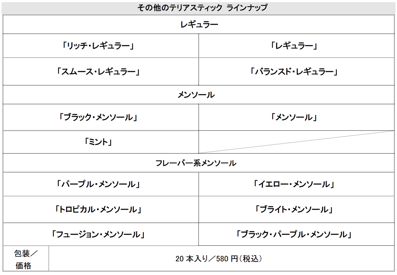 今回の「テリア ブラック イエロー メンソール」の発売により、テリアスティックのラインアップは全14種となります。