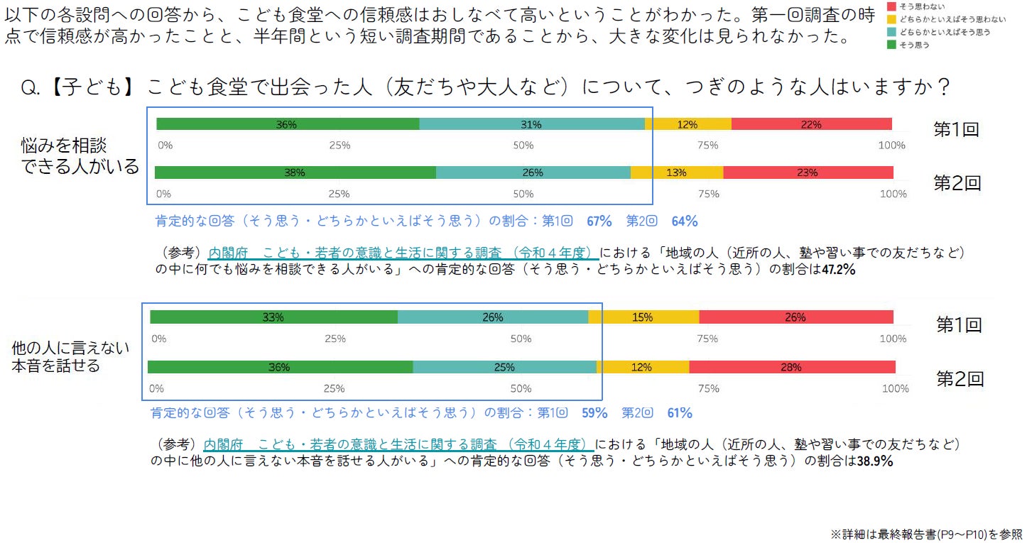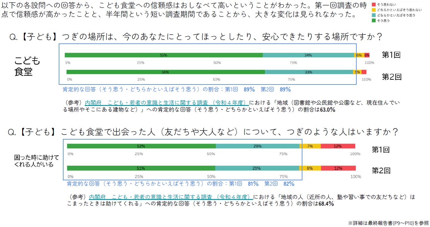 こども食堂が、ほっとしたり安心できたりする場所かどうかを尋ねたところ、「そう思う」「どちらかと言えばそう思う」と肯定的な回答をした子どもが第1回、第2回ともに89%にのぼるなど、こども食堂への信頼感は高くなっています。