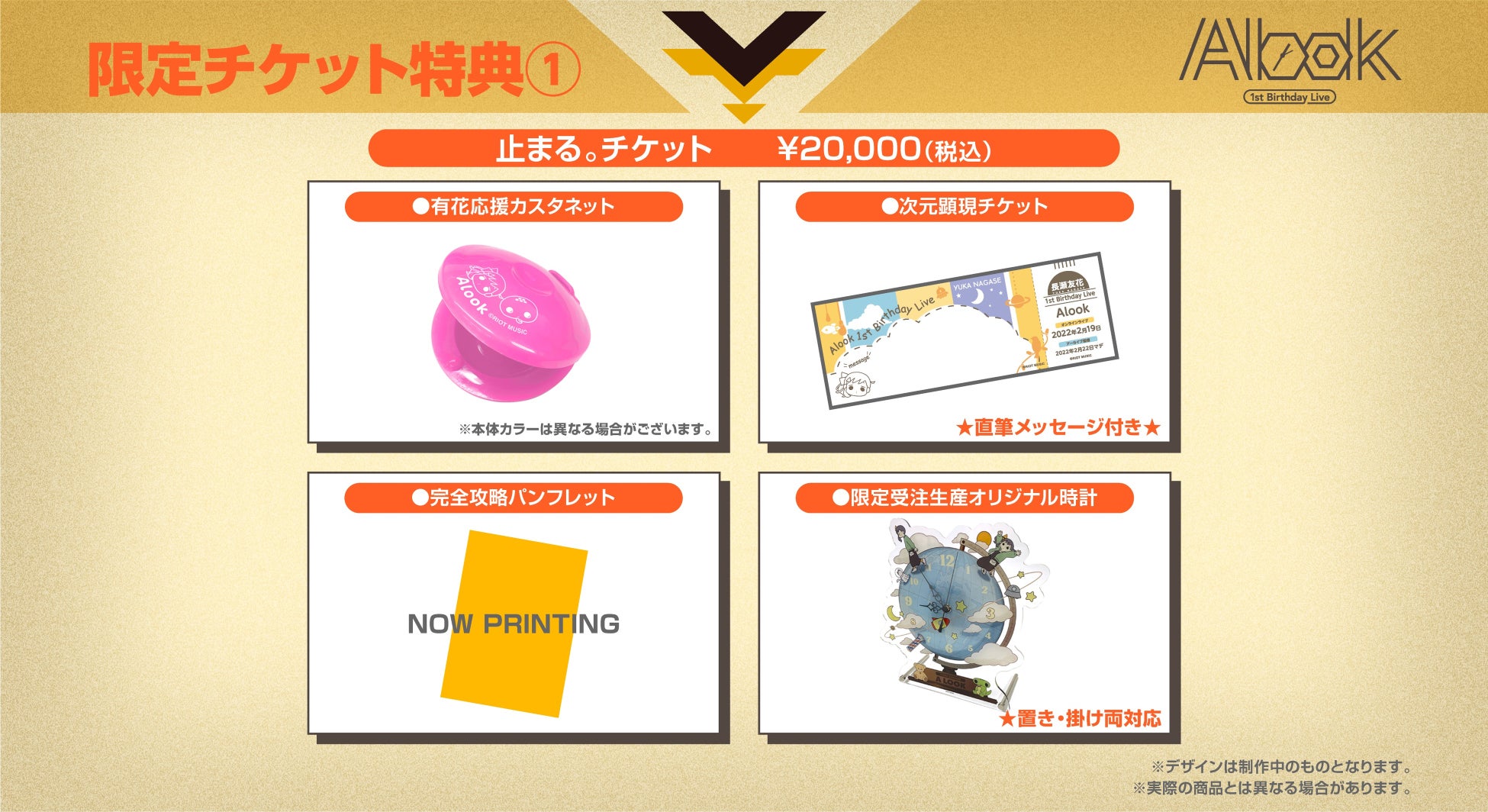 「Alook」のコンセプト「時間」を象徴する完全限定受注生産の「Alook」仕様掛け時計に加え直筆サイン入りのチケット、ライブ制作の秘蔵情報の詰まったパンフレットなどより深く、ライブの世界観に浸ることの出来るチケットとなっています。