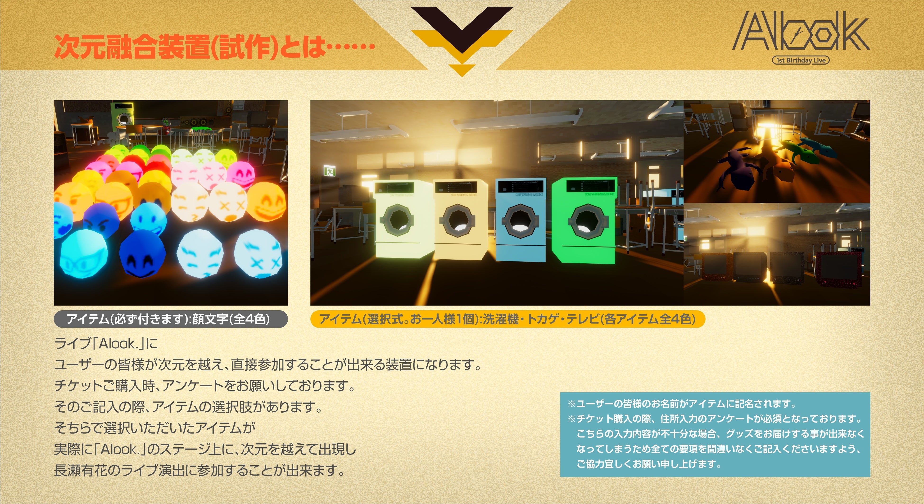 止まる。チケットの特典に加えて「Alook」を記念して発売する、長瀬有花グッズの詰め合わせに加えユーザー自身がライブ演出に加わることの出来るRIOT MUSIC初の試み「次元融合装置(試作)」が特典として付属しております。