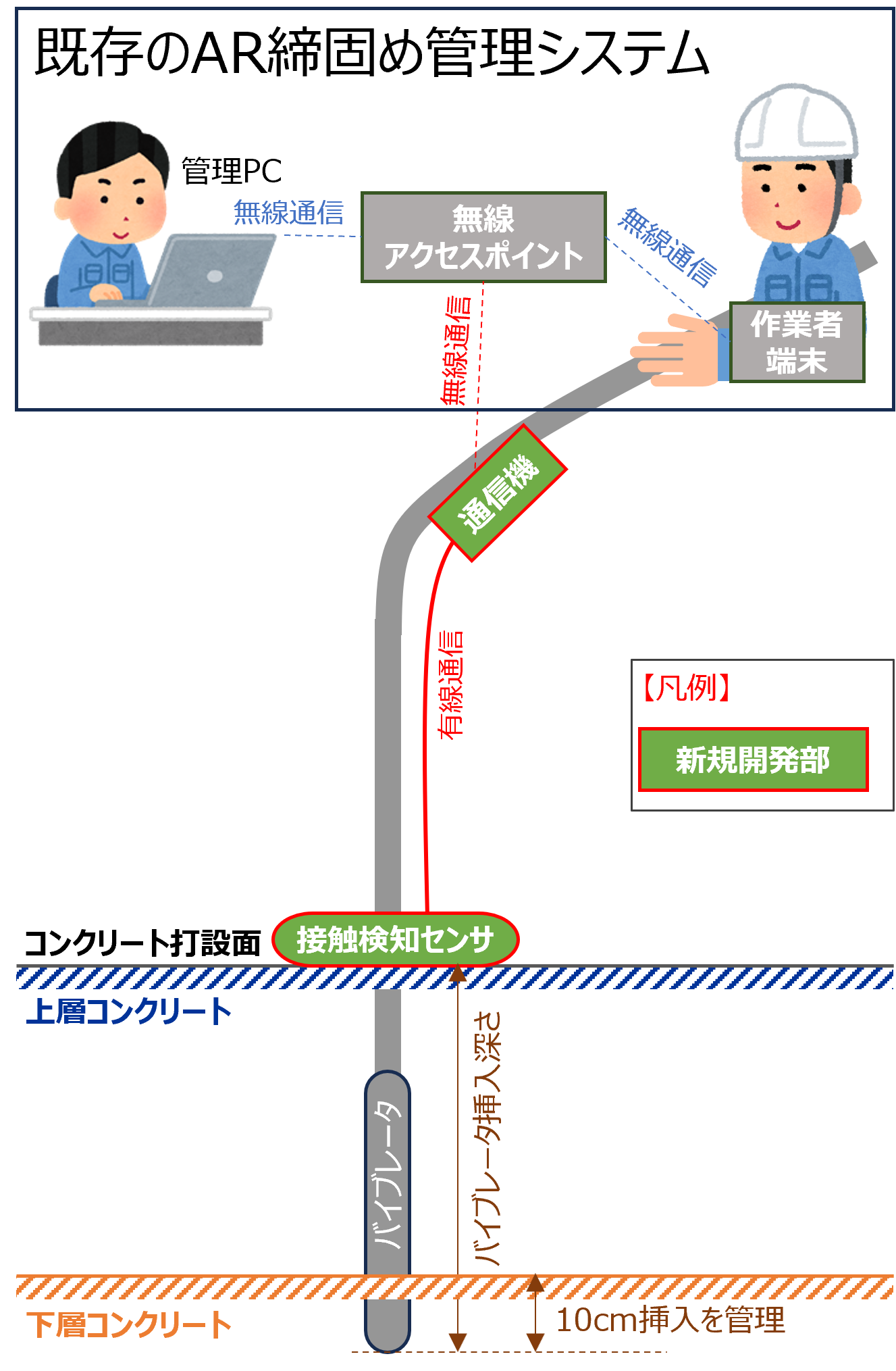 このセンサの検知結果は、既存の「AR締固め管理システム」に取り込まれ、既存の機能やユーザ・インタフェースと統合されるようシステムに機能追加し、バイブレータの挿入深さを加味して締固め時間を管理できるように拡張しました(図1)。