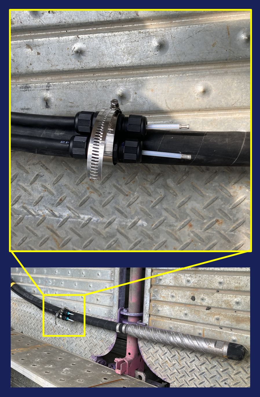 本システムを、実際の現場でコンクリート打設に試適用したところ、センサが正しく機能し、バイブレータが所定の深さまで挿入されていることをリアルタイムに確認できました(写真1)。特に今回の検証では、型枠の幅が30cmと狭く、コンクリートの打設面が作業員の足元から3m以上深い位置にあるため、バイブレータの挿入深さを作業員が目視で正確に把握することは困難です。このようなコンクリート打設において、バイブレータの挿入深さを客観的にリアルタイムに計測することができ、コンクリートの品質管理に有用であることが確認できました。