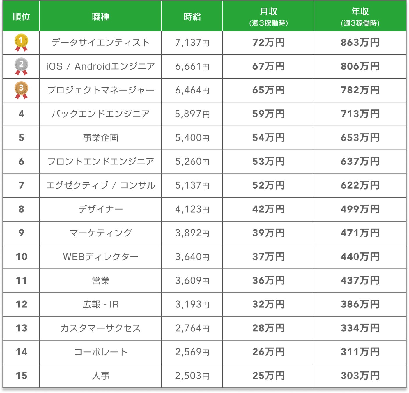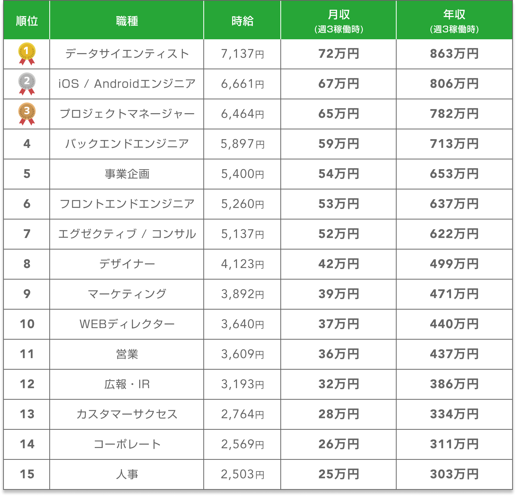 週3日稼働案件の職種別月収ランキングNo.1は「データサイエンティスト」で月72万円。上位7職種が月50万円を超える月収|SOKUDAN調査レポート