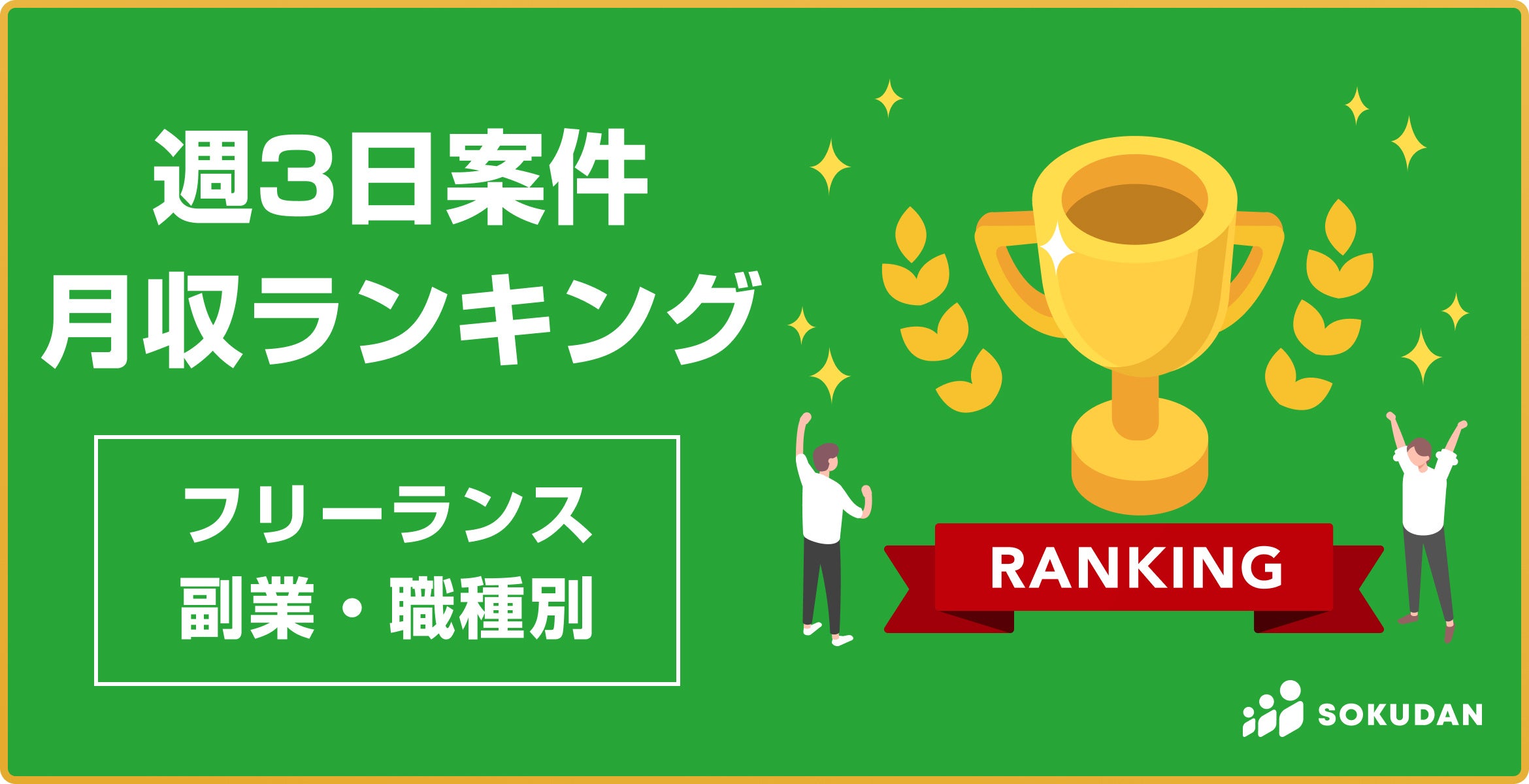 この記事では、フリーランス・副業案件の職種別平均年収・時給についての調査の一環として、SOKUDANに掲載されているフリーランス・副業案件のうち、週3日案件に限定して時給・月収・年収を職種別のランキング記事としています。