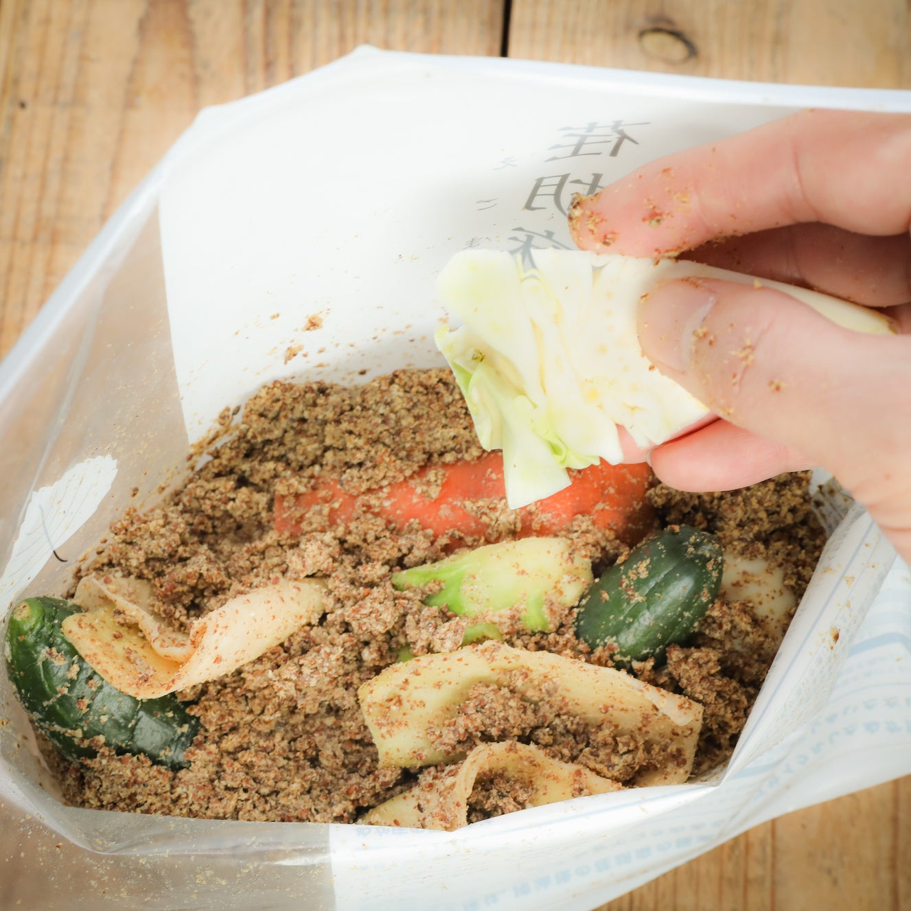 「荏胡麻の搾り実」という、今まで直接食べることのなかった原料を使用している ことから、この荏胡麻の風味や味わいを活かすためにぬか床の製造法から見直しました。 通常のぬか床は空気中や糠由来の乳酸菌を利用して作られますが、さらに米麹を加えることで、麹菌の働きにより、旨味が増し香りが引き立ちます。 さらに、30度の高温下で十分に発酵させることで、荏胡麻の味わいをより深めることが出来ました。また、荏胡麻油の搾油後の実を使用していますが、じつは50%以上もの油が搾り実に残っているそうです。 荏胡麻の搾り実をふんだんに使用することで、機能性成分を豊富に含む油分も摂取できるぬか漬けを漬けることができます。