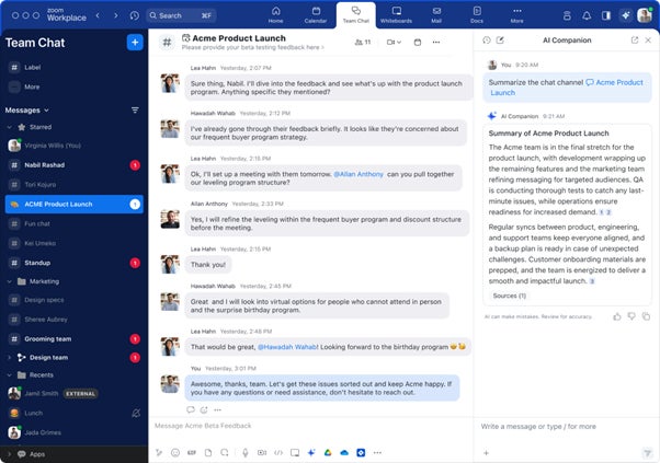 Zoom Team Chat チャネル内の未読メッセージを要約することで、チームの会話を簡単に把握できるようにし、未読チャットが埋もれることを防ぎます。新しいホームタブ内で、AI Companion は未読のチャットとメールに基づき、ユーザーに最新情報の一覧を提供できるようになります。