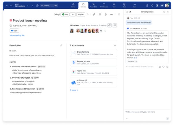 Zoom Workplace 全体で動作し、グループ チャット メッセージや過去のミーティングの議事録といった複数の情報源からコンテキストを収集し、より的確にミーティングに備えた推奨事項を提供します。
